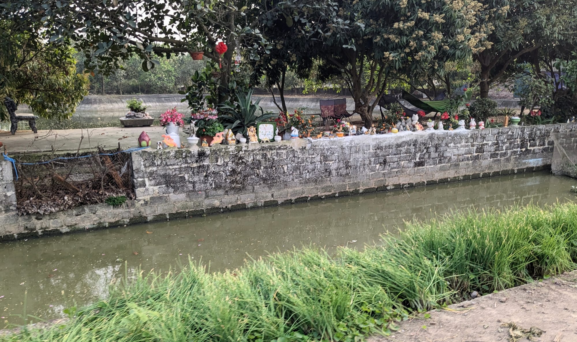 On one of my bicycle routes through the rice fields, I often pass by a home which always fascinates me. The house is merely a small shack of green-painted corrugated metal, but the grounds around it are tended beautifully. There is a duck pond and a couple of shade trees with a hammock between it. And along a rock wall facing the street are several dozen well-polished porcelain figurines.