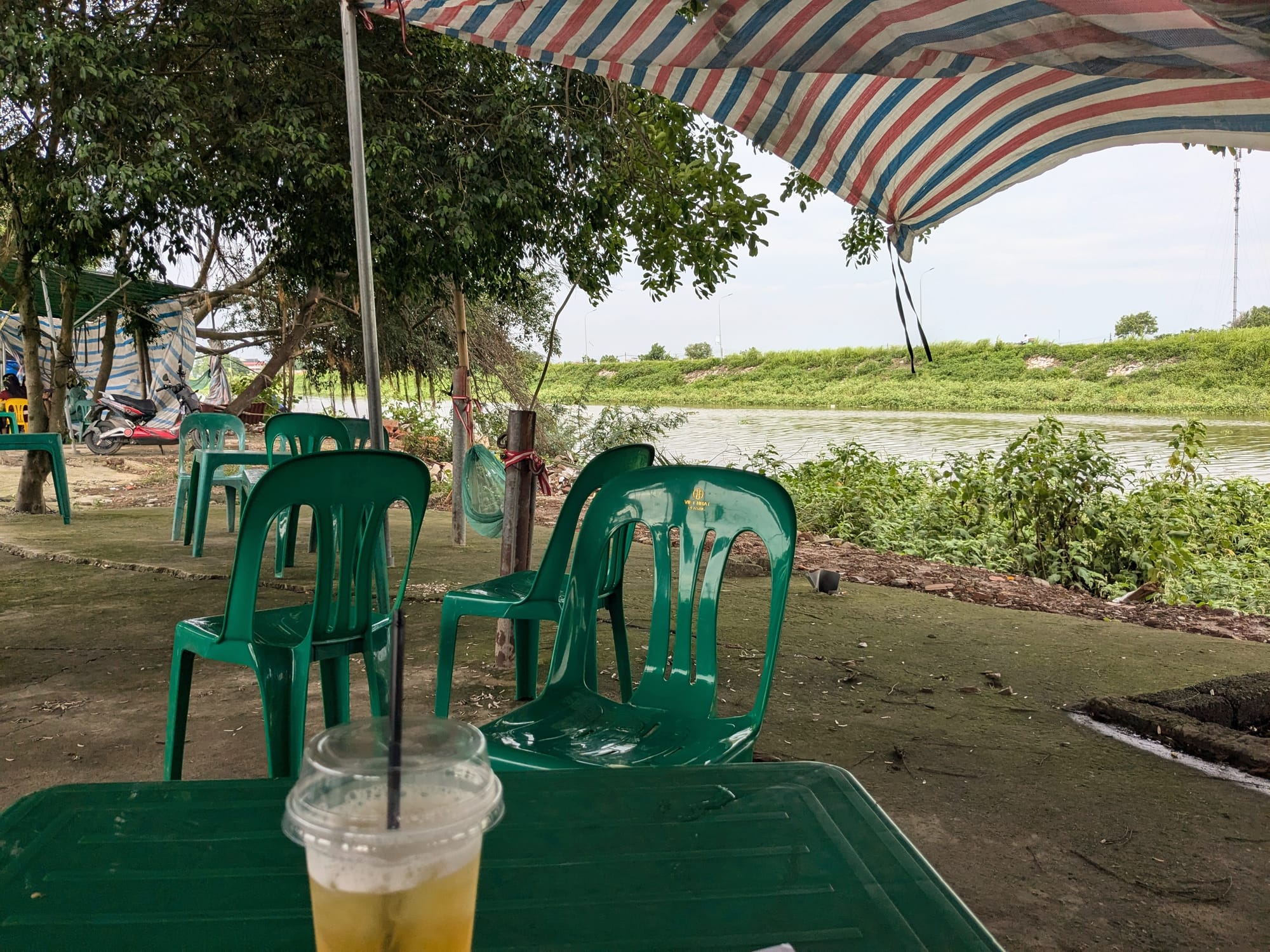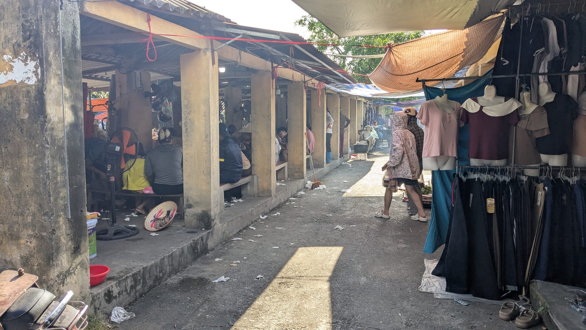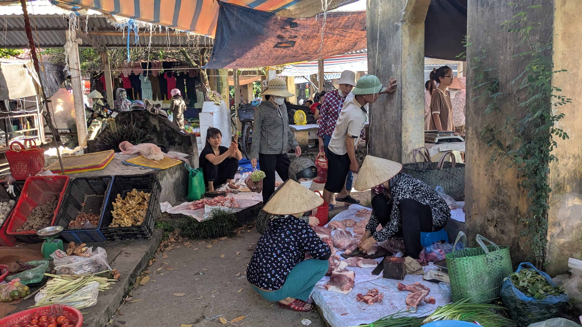 Elsewhere in the market, there are two vendors who exclusively sell fruit - a lot of it imported from south and central Việt Nam in styrofoam crates. There are usually 1 or 2 vendors selling boiled pig intestines (and other parts) out of igloo coolers: an extra protein to add to your spread when you have company for dinner. There's a woman who is always frying nem (spring rolls) on a card table in front of her house. She always shouts and waves me over to buy; I'm a regular now, it's cheap and it's a good appetizer so I can eat something quick before cooking the rest of my dinner.