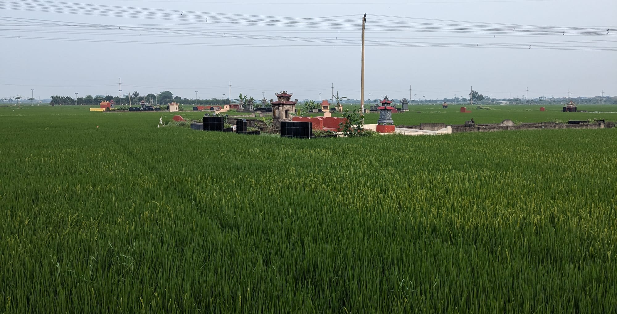 We sit for a few minutes with a beautiful view, as two kids come and climb up into the tree to listen to us. The mountains form a backdrop, along with a rare clump of trees, and this section of rice fields is punctuated by a well-maintained cemetery. Graves here are built above ground due to all the water but also to serve as full shrines where offerings can be left and incense burned. The well-maintained graves are frequently cleaned and sometimes freshly painted bright white or yellow. Not everyone buys plots in the cemeteries and the fields are also dotted with shrines pointing chaotically in different directions.