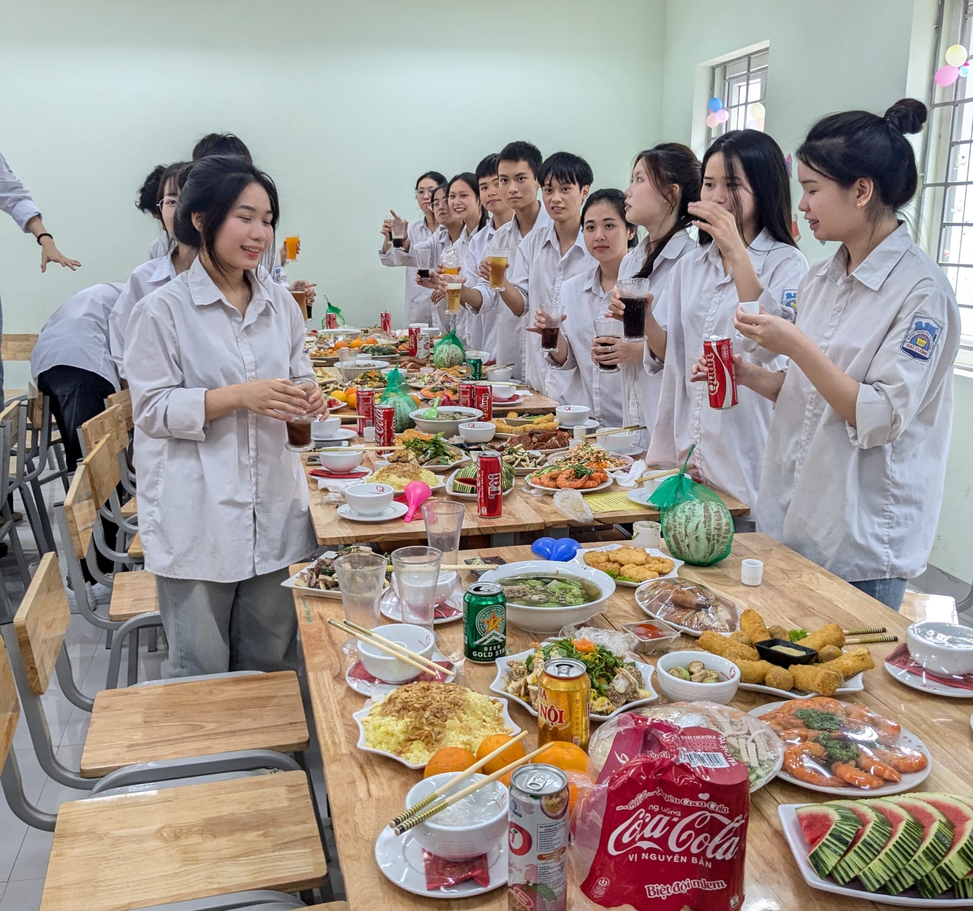 I sit next to the oldest male teachers, who mostly teach gym and are the most jocular and fun to be around. As the dishes are slowly distributed among the many tables around the teachers' room by the catering staff, with plastic wrap still over them, I try to name all the foods in Vietnamese.