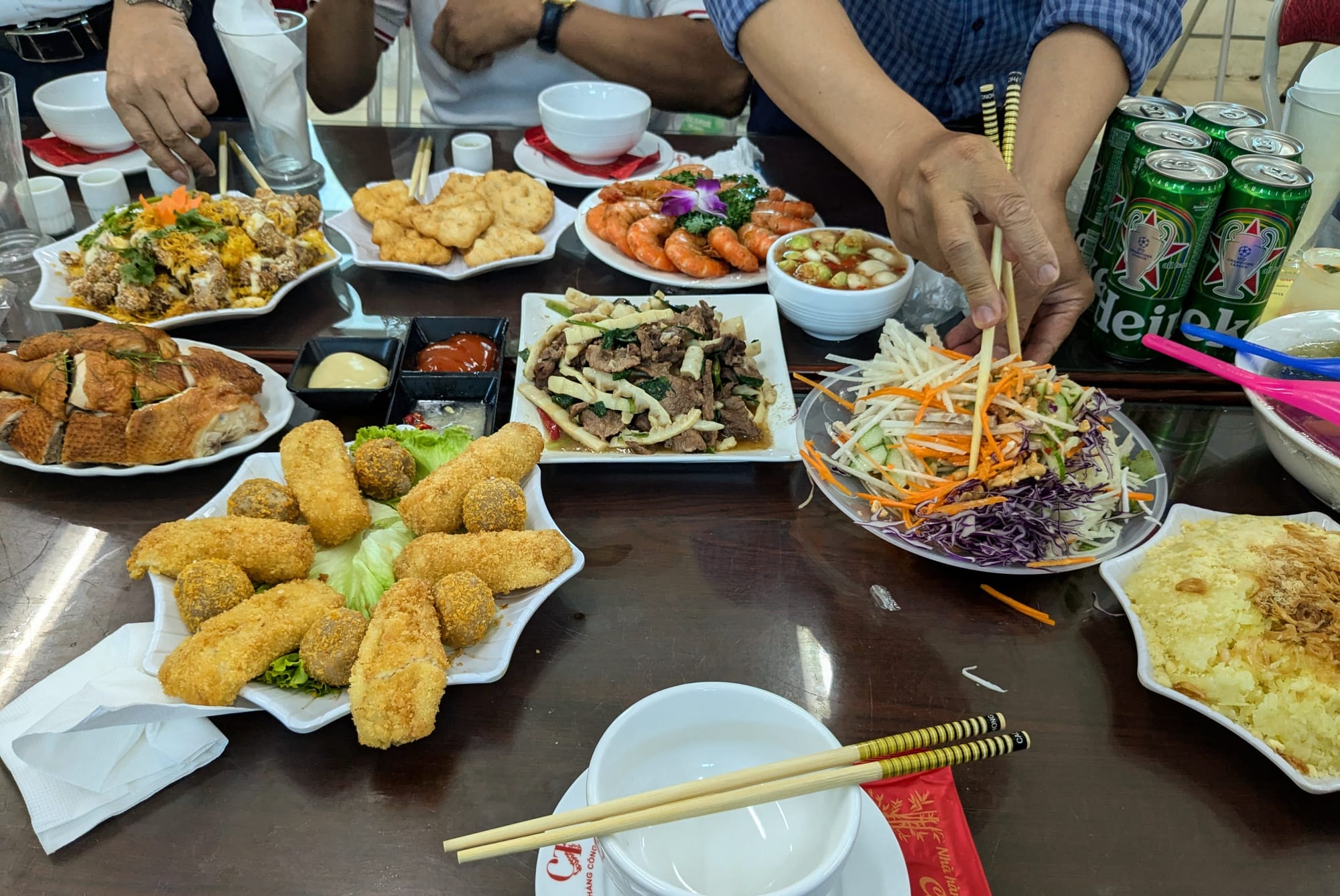 With the banquet set, slim cans of Heineken beer are passed out with acrylic glasses to pour it into. Despite Việt Nam having its own full portfolio of lager beers, ranging from the cheap to the local favorite to the slightly more expensive, the mystique of a Western brand means Heineken is often used for special occasions. It is brewed and canned here in Hà Nội. I think Heineken's red star logo has really been fortuitous for their marketing here.
