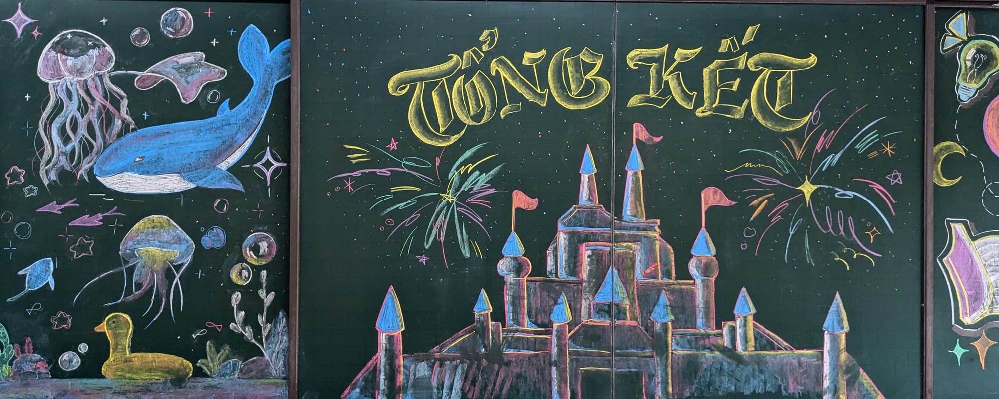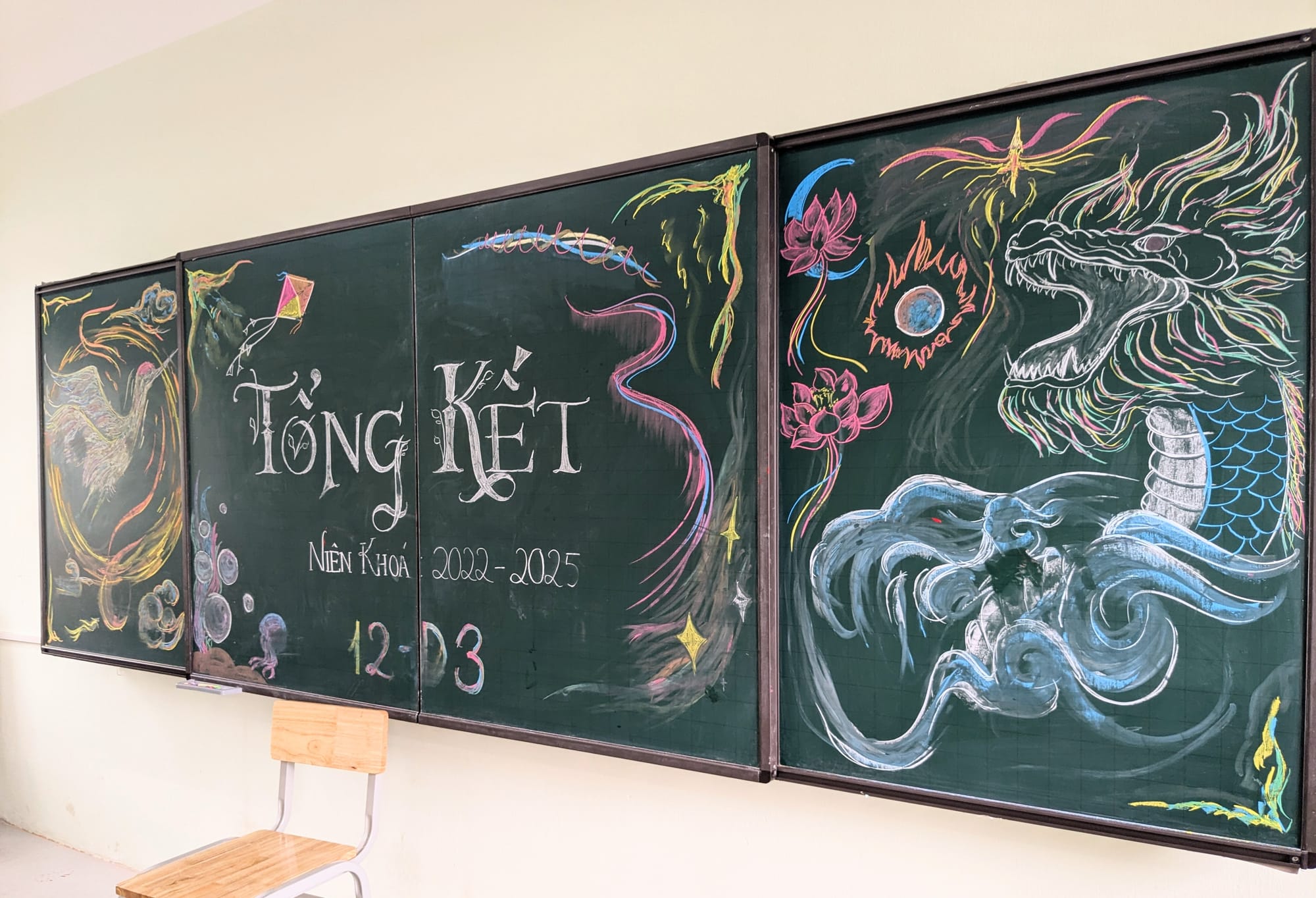 We do this in the classrooms of all six graduating classes. An elaborate chalk mural adorns the chalkboard in some rooms as the students have come to the school over the weekend to decorate their rooms for the party.
