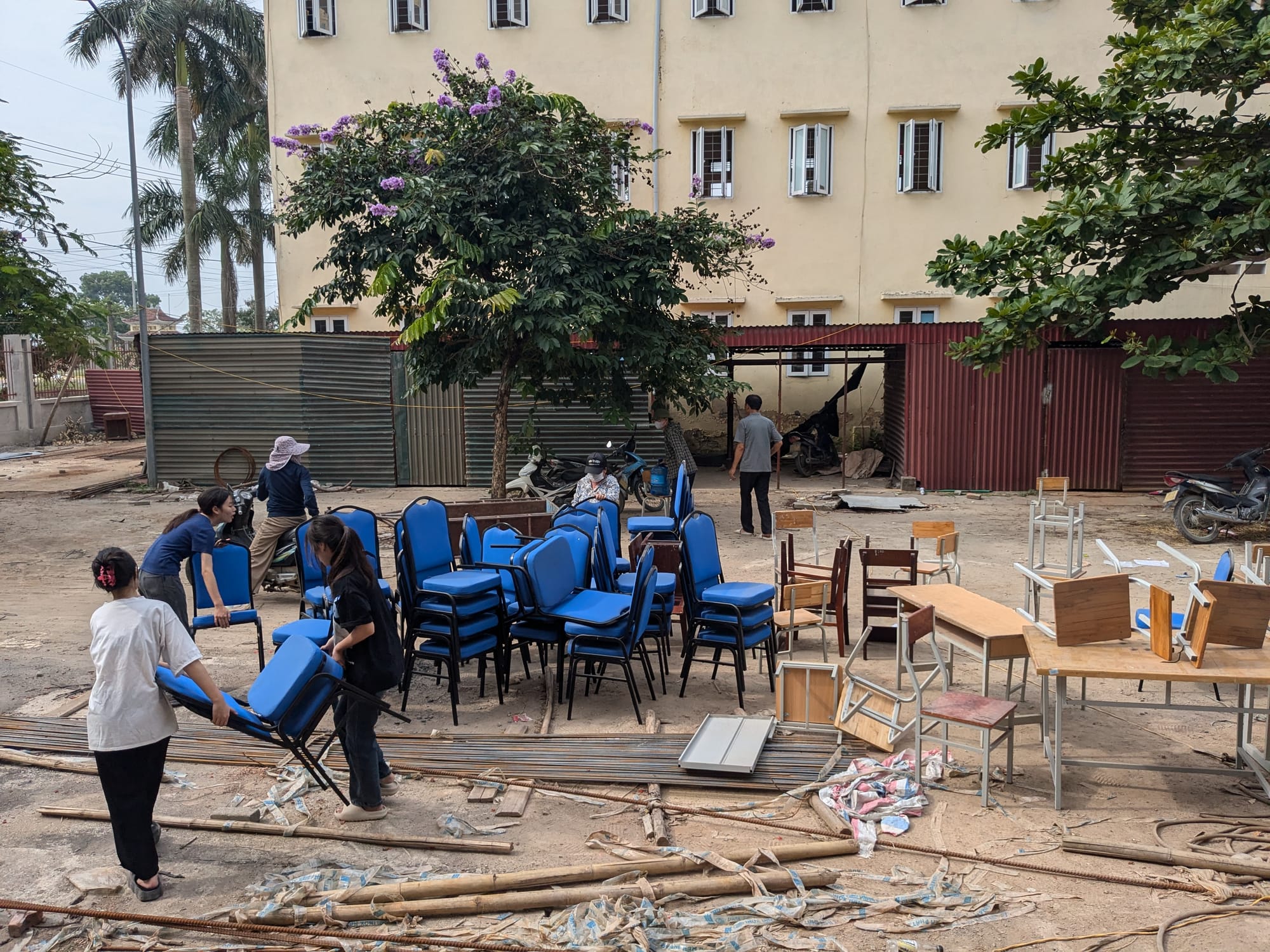 I try to follow some of the students to load the chairs outside onto a motorbike-pulled wagon to transport them to the other side of the school.
