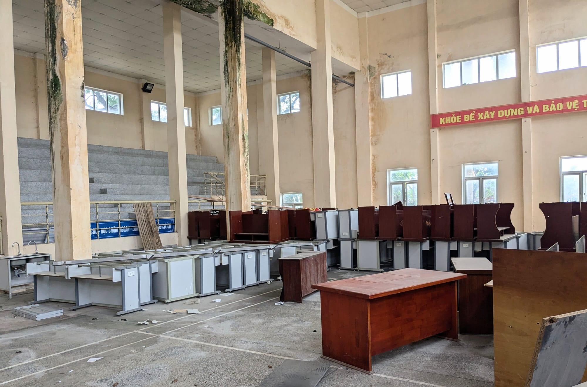 After my ready-to-go breakfast of hardboiled egg, fruit and coffee I walk over to see what's happening at the gym. I've never been in our gym before as it's been closed and in the middle of an active construction zone. The scene inside would make a great set for the TV series "The Last of Us". There are piles of furniture everywhere even up on the bleachers: wardrobes, wooden desks, chairs & stools, metal science laboratory workbenches with electrical wiring dangling from them. The roof has been leaking in several places leading to several walls to be draped with glistening green slime.