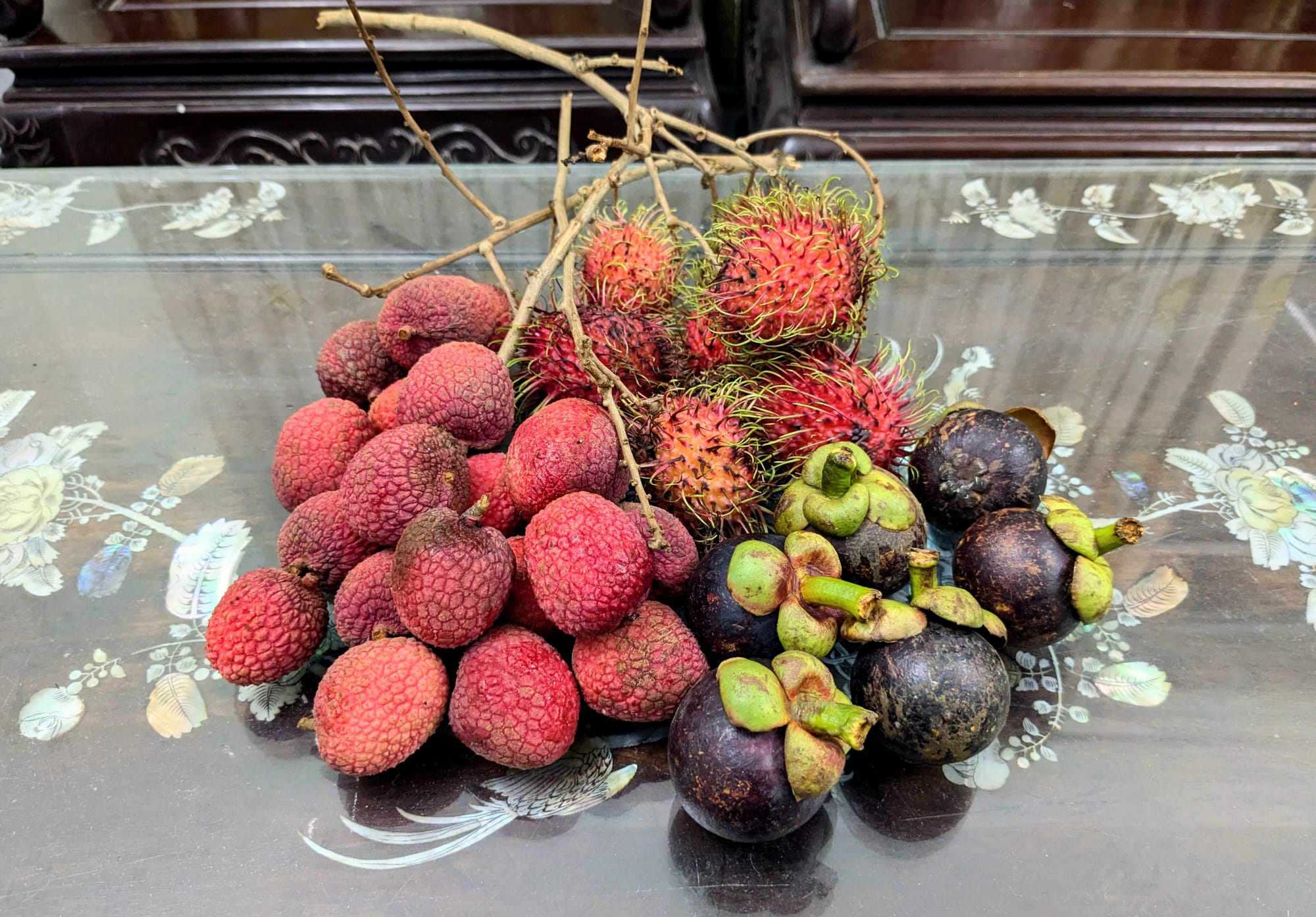 The lychee is the king of a whole array of tropical berries with tough, inedible skin. The longan, which leaves your fingers and mouth feeling sticky. The mangosteen with a tougher outer skin and milkier flesh. The rambutan with its long velcro-like hairs, and an edible pit that tastes like almond (this one was popular with us during Vietnamese language lessons, because of its fanciful name 'chôm chôm'.) There are even others more obscure, without names in English.
