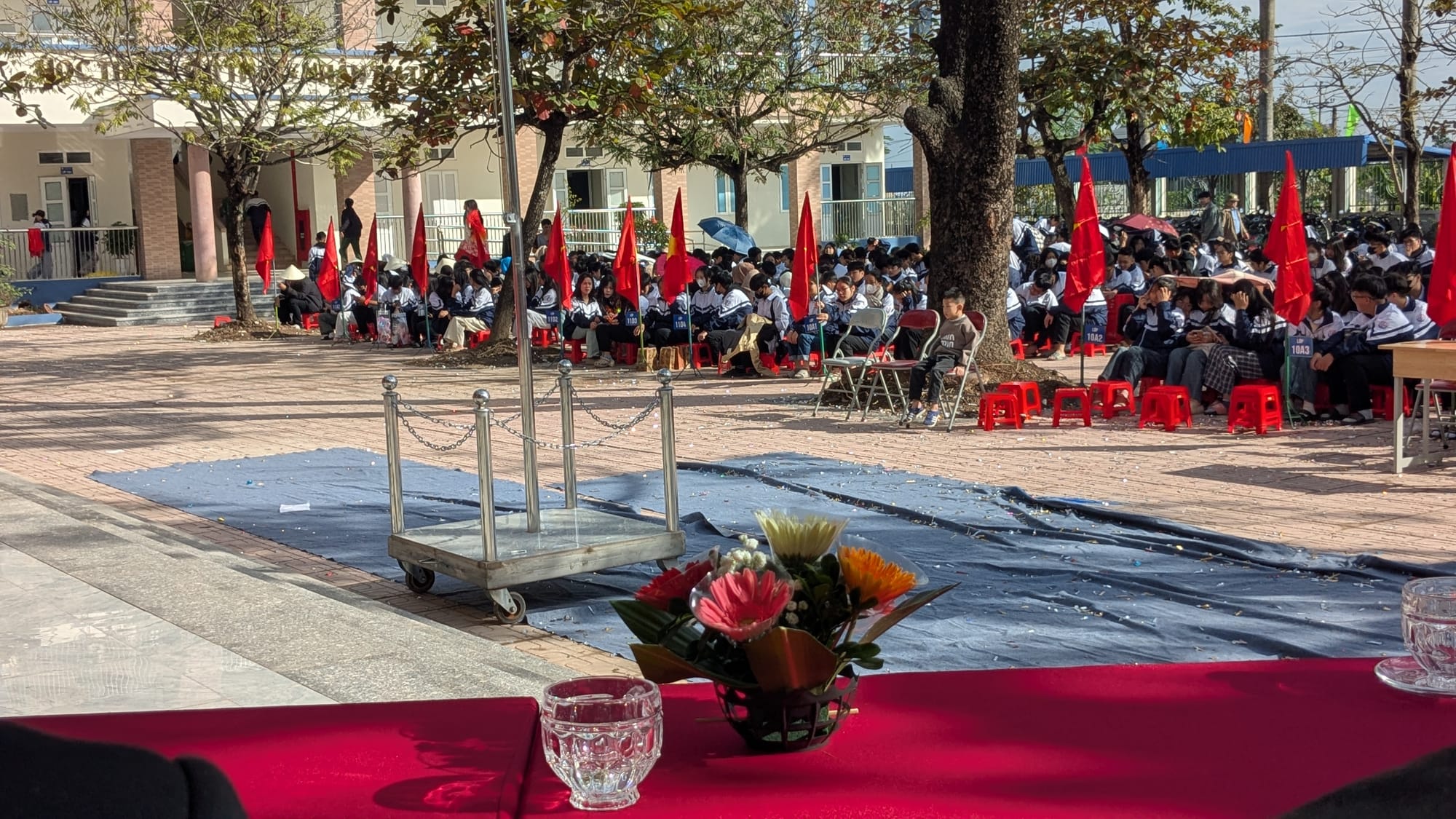 On a normal Monday morning, the courtyard of a Vietnamese public school is bustling with activity for the flag ceremony. The students pull stacks of plastic stools out from underneath the stairwells and line them up in neat rows on the tiled courtyard, two rows per class. All of the tenth-grade classes on one side, then eleventh-grade, then twelfth-grade. They all stand and sing the Vietnamese national anthem and listen to school announcements followed by a pep talk from the school's principal.