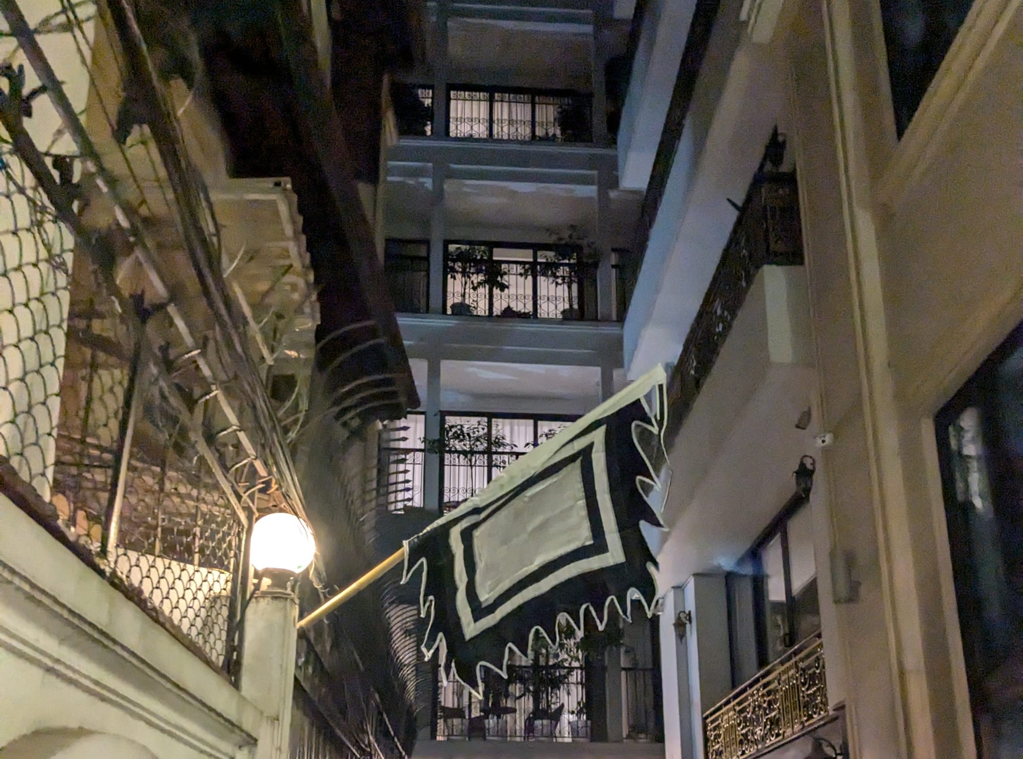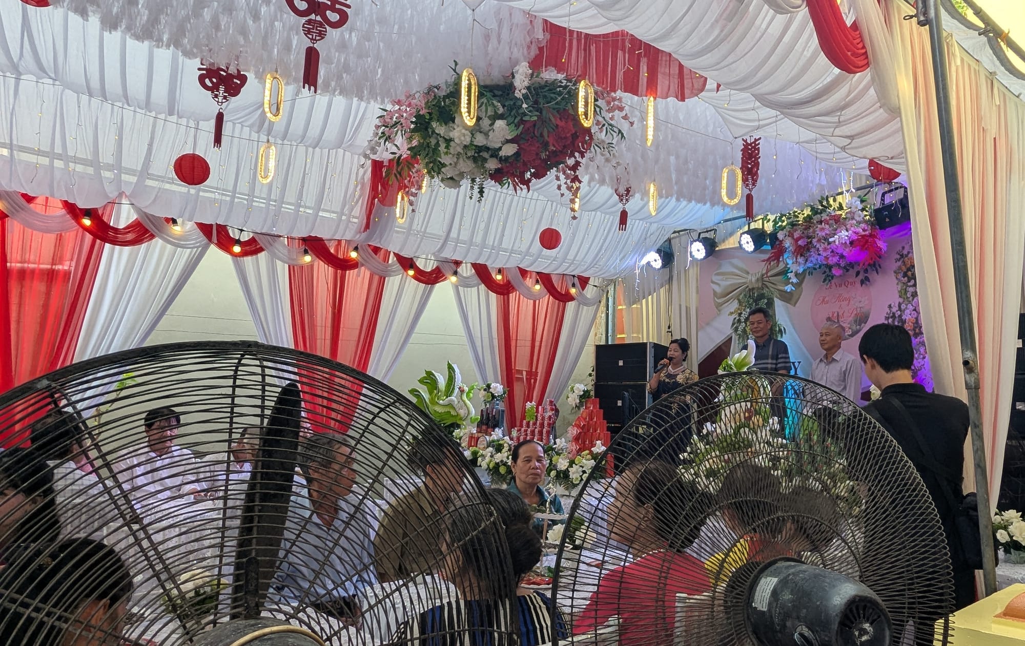 At every wedding the children come to tie a rope, and the groom's family must hand over an envelope with five or six coins to pass it. But they heard that there would be journalists attending so they told each other to not do this outdated custom. There was a sound of firecrackers, and the pink smoke splashed onto the orchid trellis around the wedding party entrance.