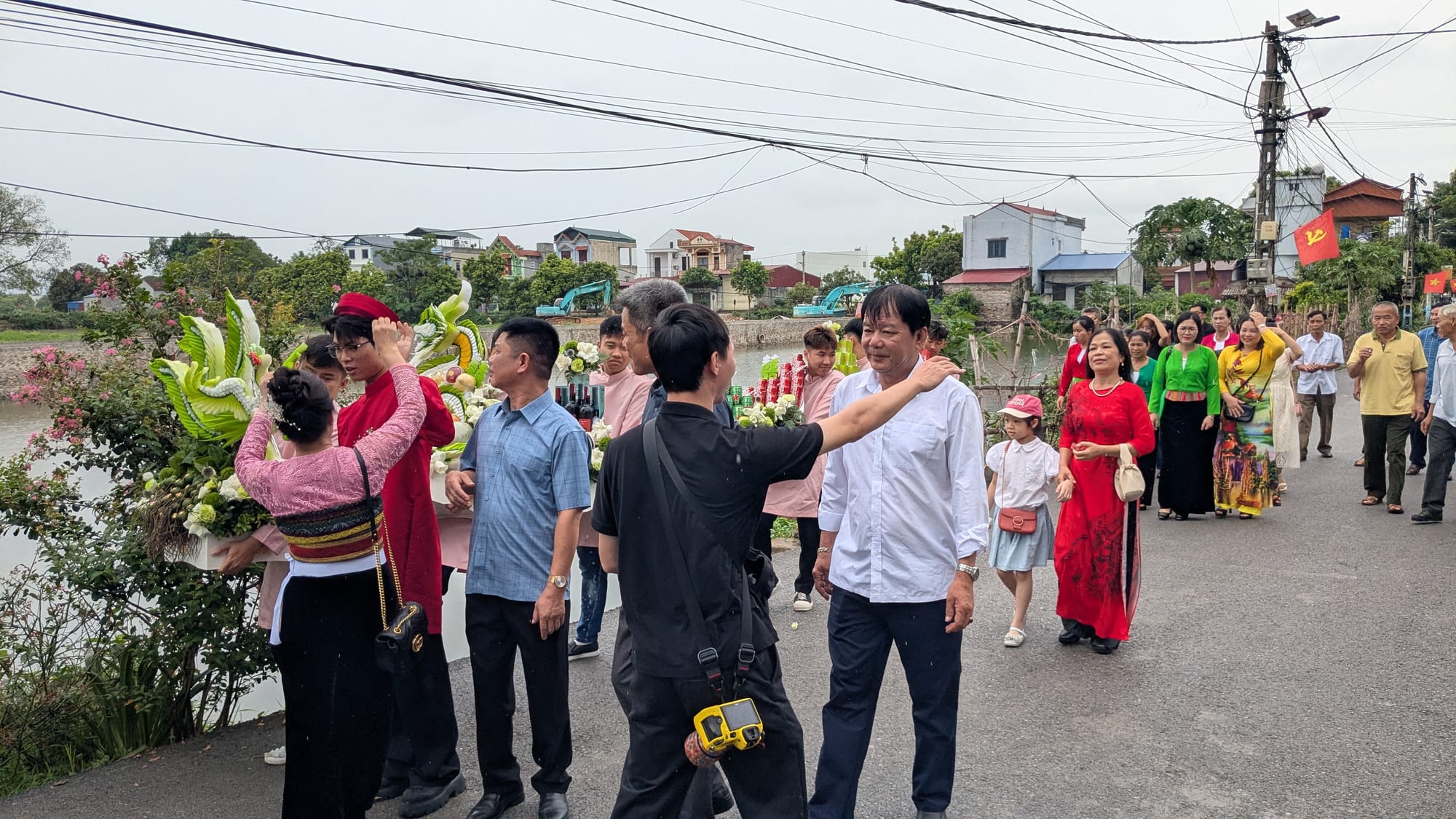 In the early morning, the village children waited by the pond to see the wedding cars arrive. Closer to noon, the groom's party arrives in 10 black cars driving single file. Phụng's writer friends are part of the party and when they get out of their cars there is a mix of traditional Vietnamese clothing and European clothing. Phụng wears a turban and silk shirt.