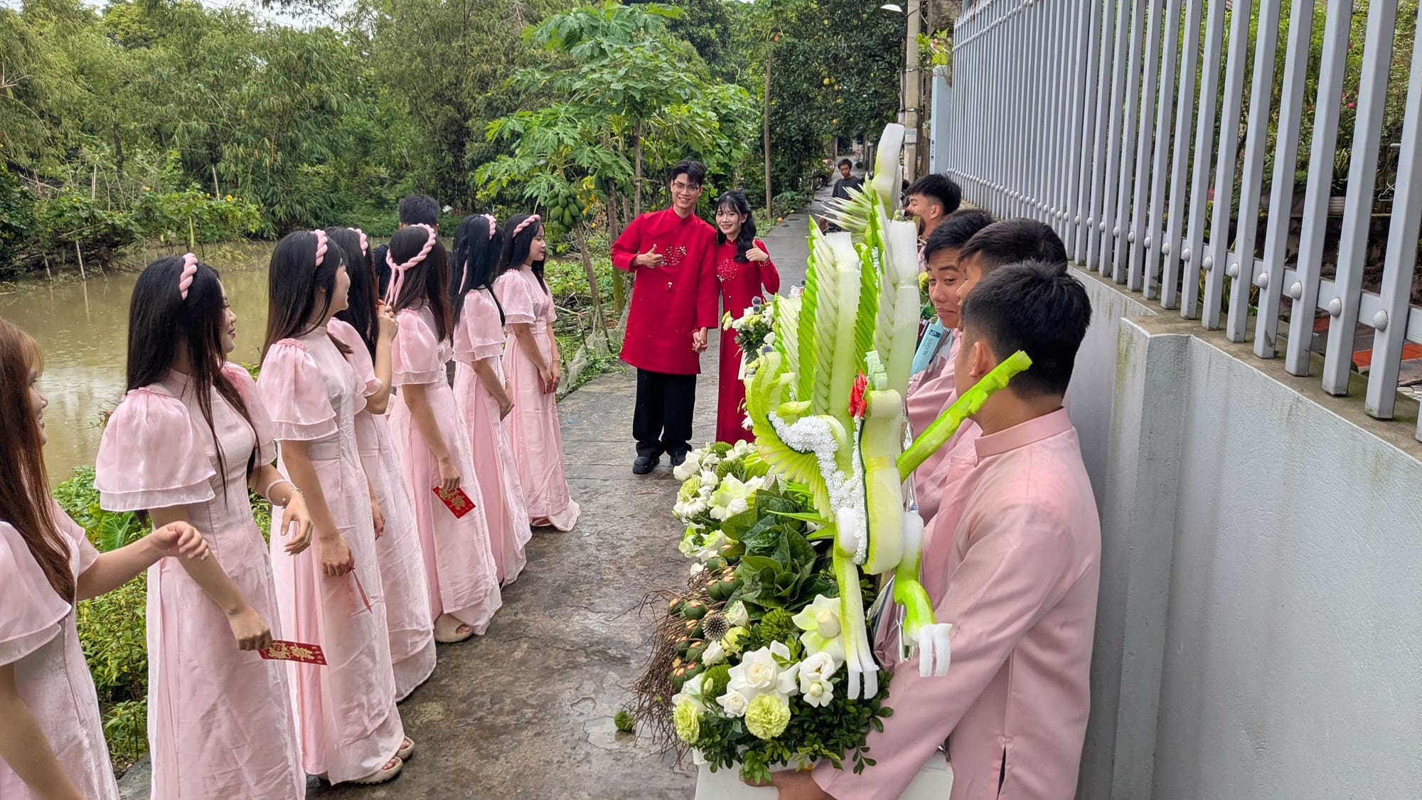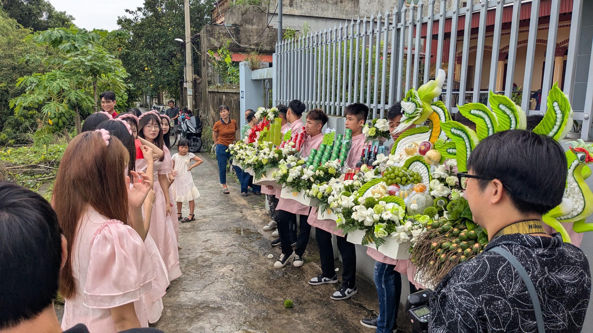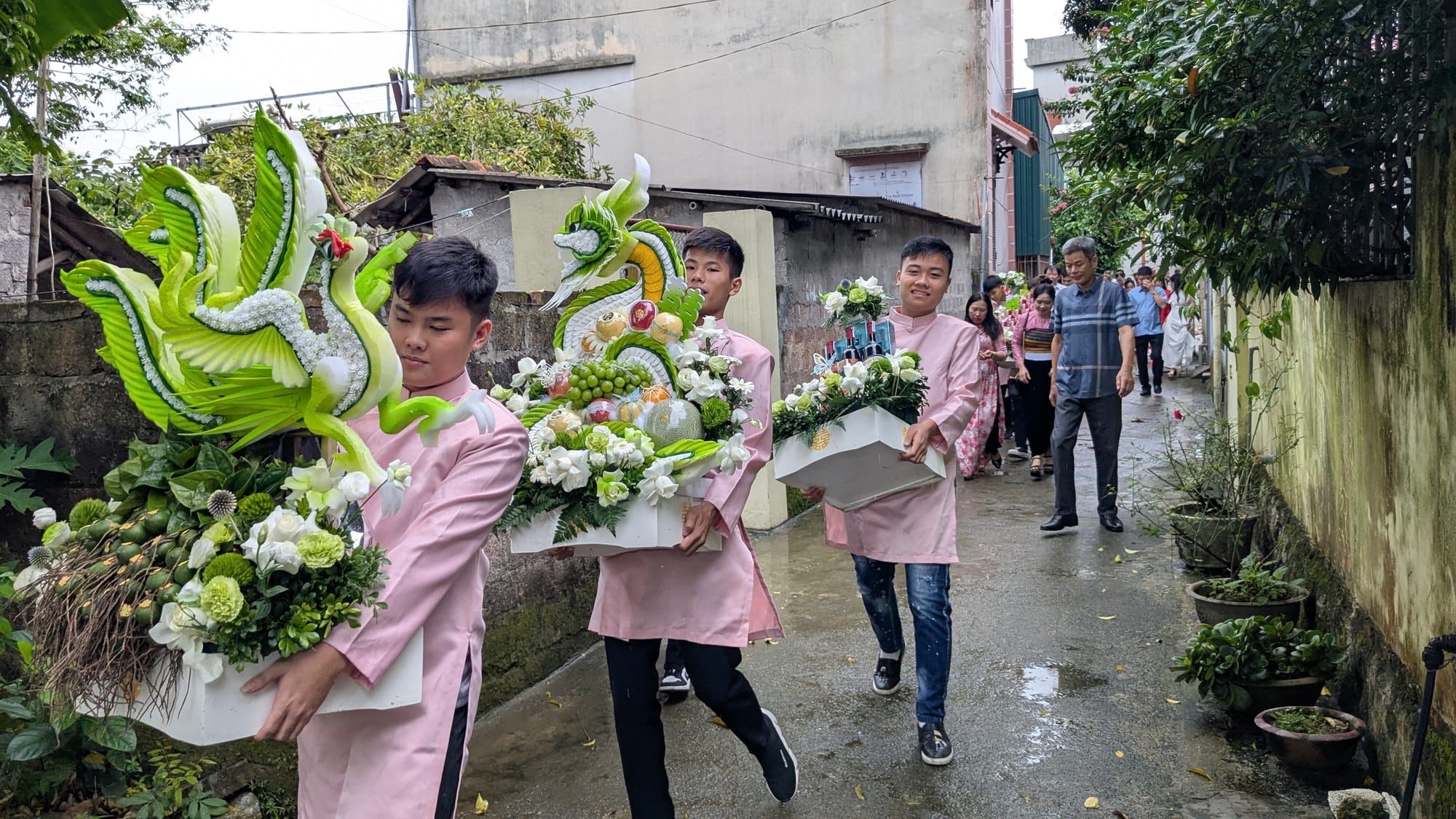 An engagement party was held by Phụng a month before the wedding. Many families in Giáp Nhất village received a package containing one bánh chưng (a square rice cake), one bánh dầy (a round rice cake), a package of spring rolls, areca nuts and betel leaves.