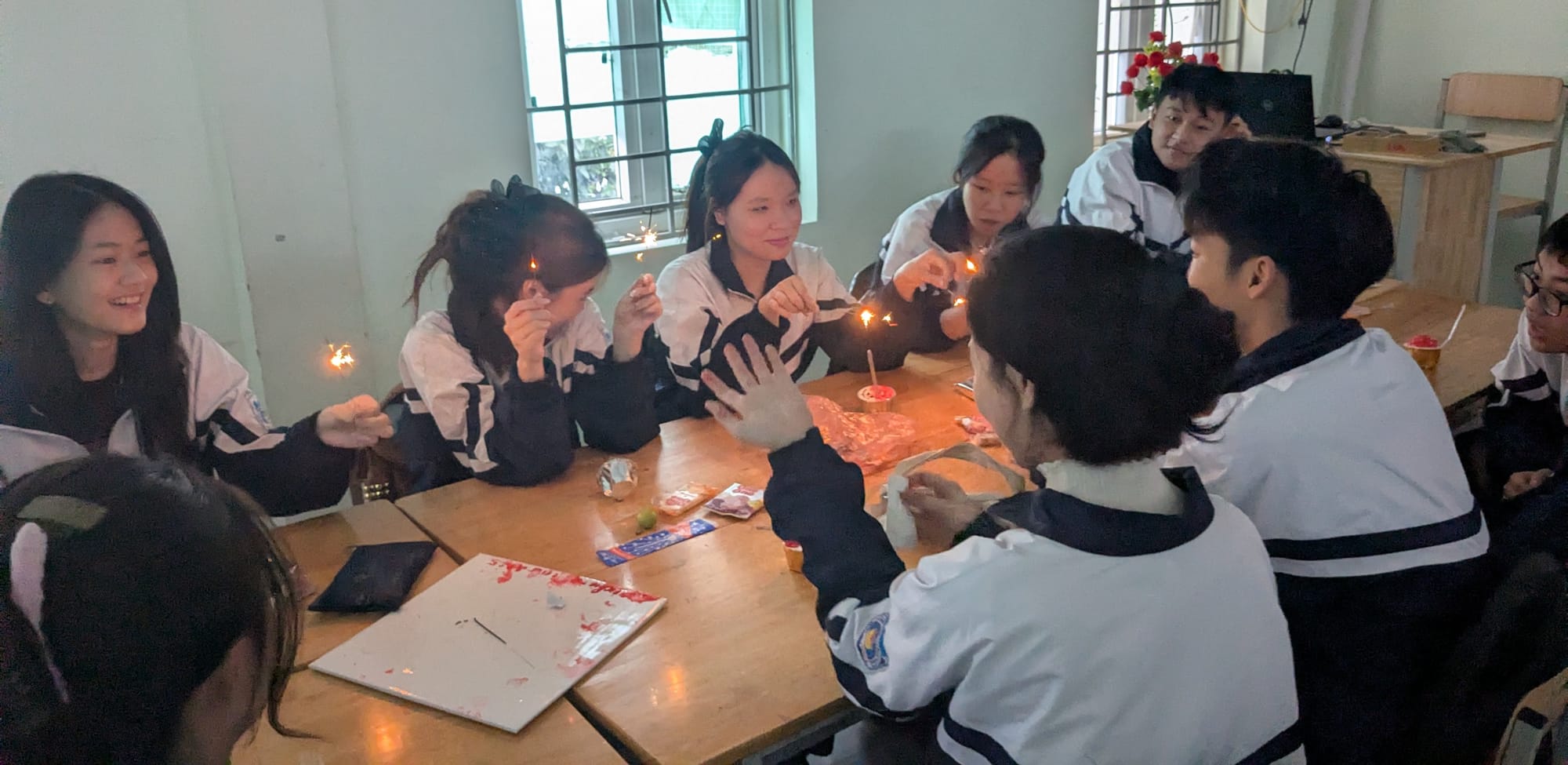 The lights are off and one student has a Christmas cake at the front of the class; some of the candles are lit. They all sing the Happy Birthday song perfectly (it's common here), and then I blow out the candles. One of the star male students of this class comes up and very formally wishes me happy birthday and "success in the new year". Then Ms. T asks another student to speak. Her eyes grow wide for a second because I guess she wasn't planning on it but she gives another good (always very formal) wish in good English.