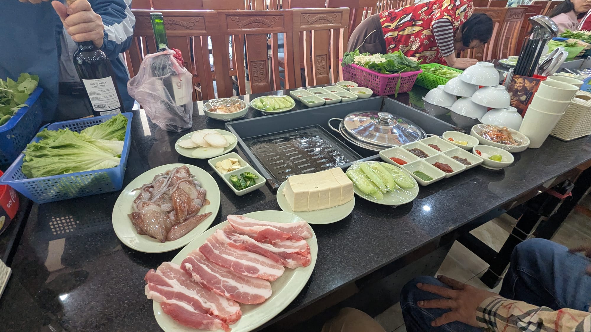 Despite another teacher having a Christmas birthday and usually only going out for joint birthday lunches, this year the school arranges my own birthday lunch and we all pack into a van to go to the nearest city. They have heard that I like seafood and so this time we go to a seafood restaurant that has both hotpot and a table grill at each table. With hints of Korean cuisine, there is kimchi and savory ssamjang-style sauces on the table. I bring a bottle of western red wine, as does my principal, so everyone gets to start with that before the Vietnamese rice wine is broken out.