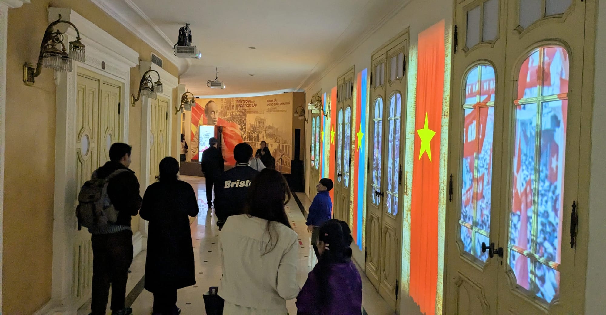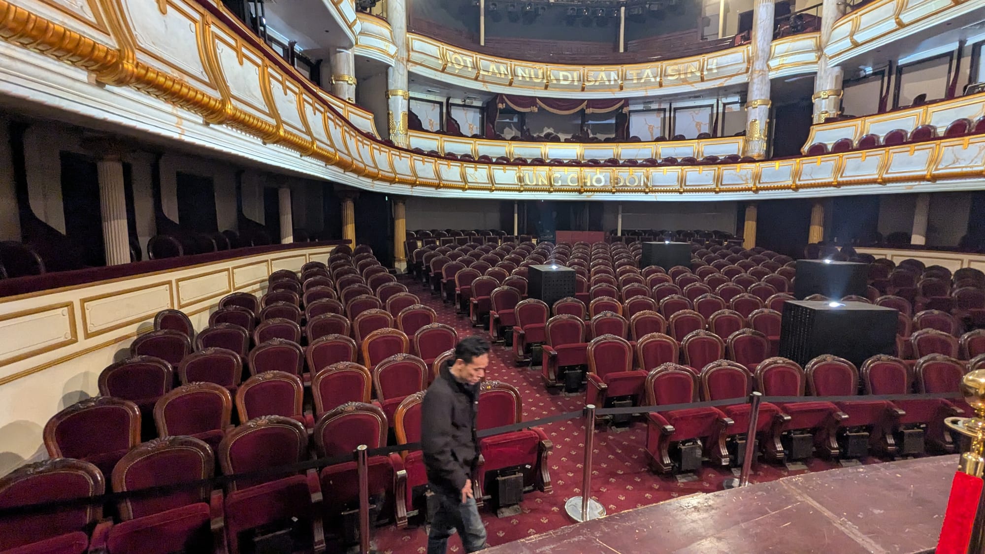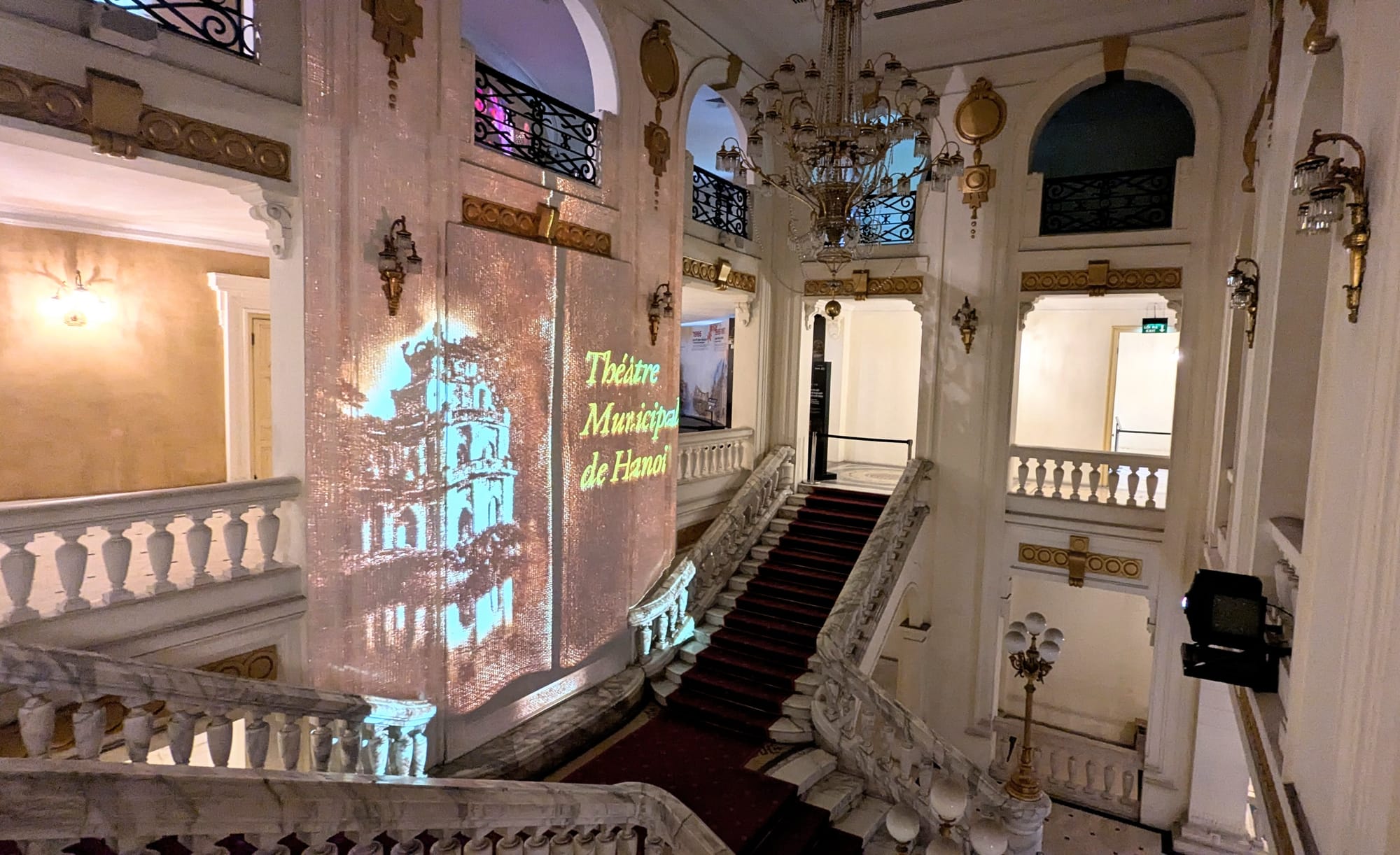 The exhibit led us through each level of the opera house one at a time, with projections onto some of the walls. In the place where some of the windows would be, projections showed a simulated view of Hanoi with the rallies on the streets outside 80 years ago. The black and white tiles of the stairwells have been unchanged and restored since 1902. The tour finally led us back down through these stairwells to backstage, where the stage equipment was demonstrated and then the curtains were drawn back and the auditorium was transformed with music and projections into a light show highlighting the intricate architecture.
