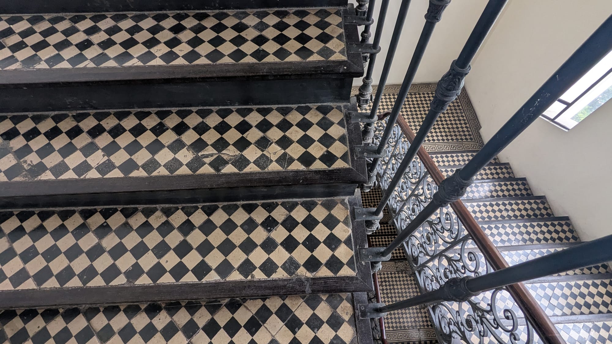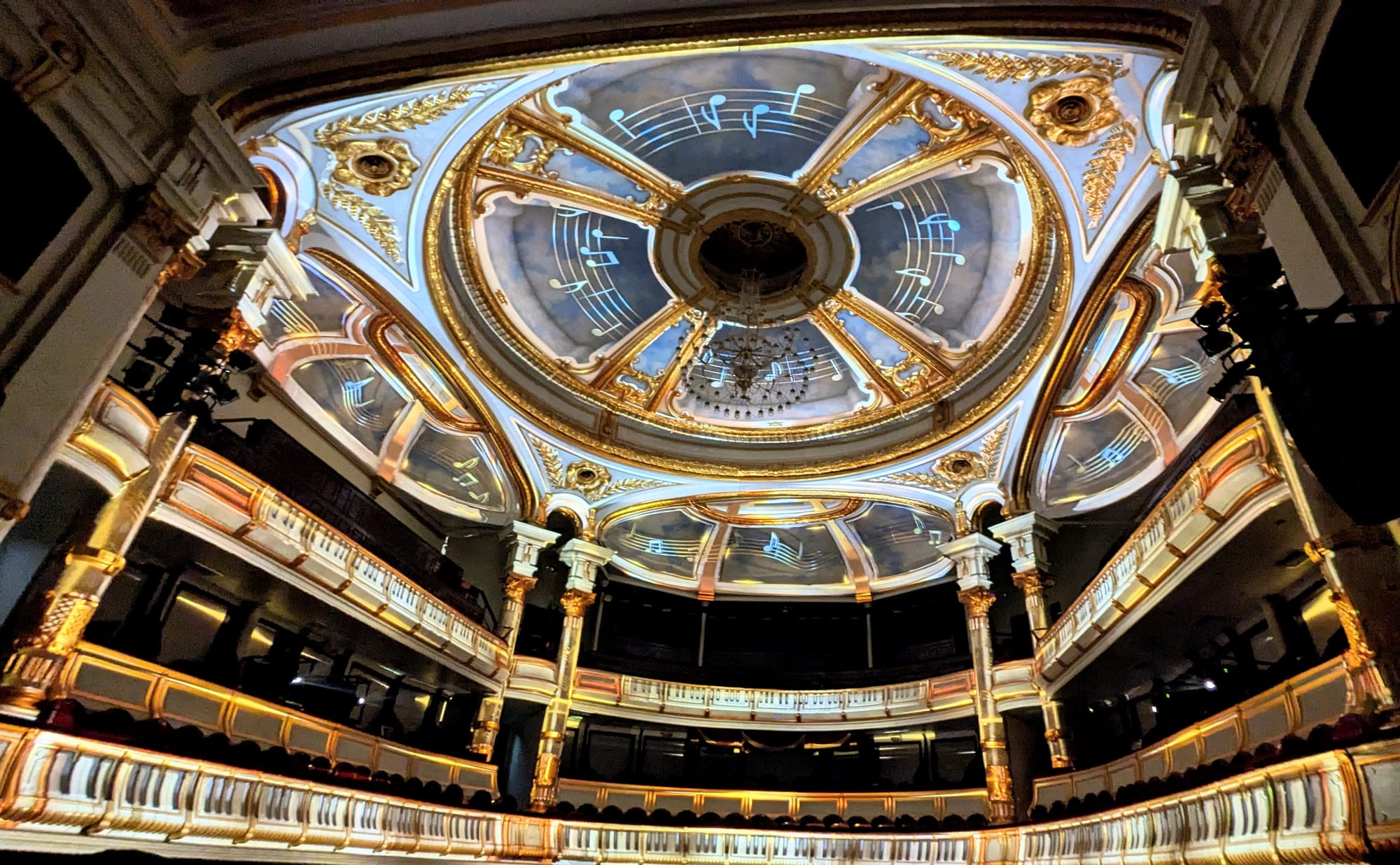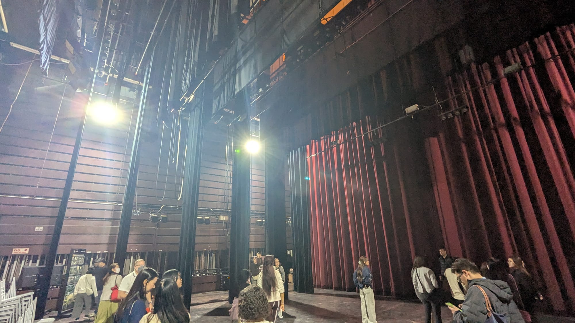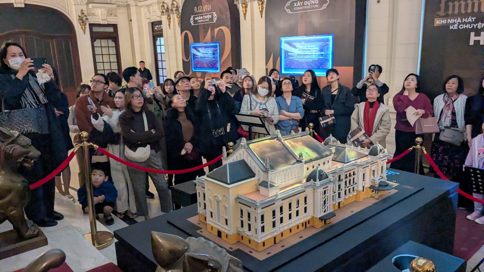 The exhibit led us through each level of the opera house one at a time, with projections onto some of the walls. In the place where some of the windows would be, projections showed a simulated view of Hanoi with the rallies on the streets outside 80 years ago. The black and white tiles of the stairwells have been unchanged and restored since 1902. The tour finally led us back down through these stairwells to backstage, where the stage equipment was demonstrated and then the curtains were drawn back and the auditorium was transformed with music and projections into a light show highlighting the intricate architecture.