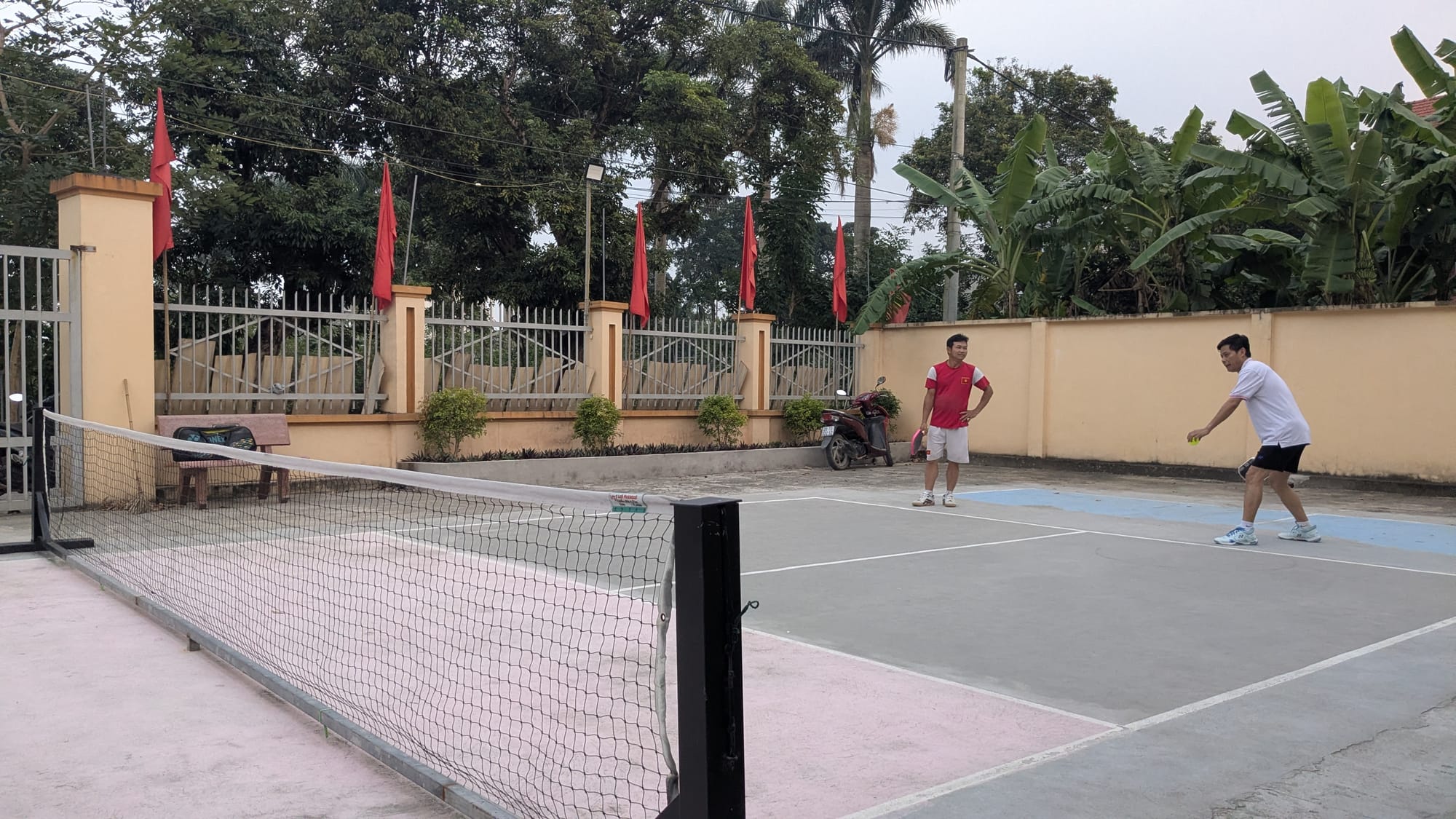 Many of my students are obsessed with pickleball but I hadn't seen a court in my area until this one. Every village has a communal meeting space called a nhà văn hóa or cultural center. Larger villages have larger cultural centers, often with a spacious courtyard for playing games or sports. In this village, the building is quite small, and the courtyard has room for one court; previously for badminton, but now a pickleball court.