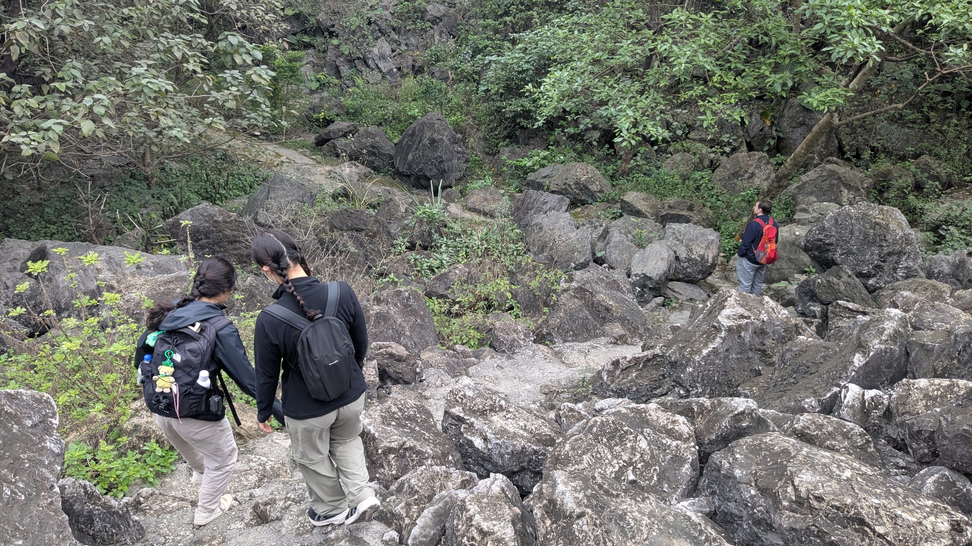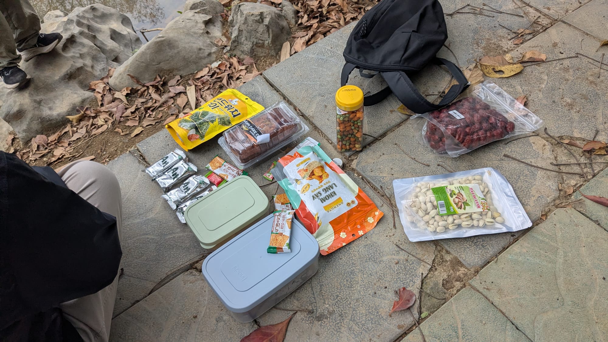 The hike itself was very short, less than a quarter of a mile to a picturesque pond with several natural caves. We sat down on a stone platform to have a picnic of nuts, dried jujubes, snack crackers and banana bread. The morning was grey and a little chilly.