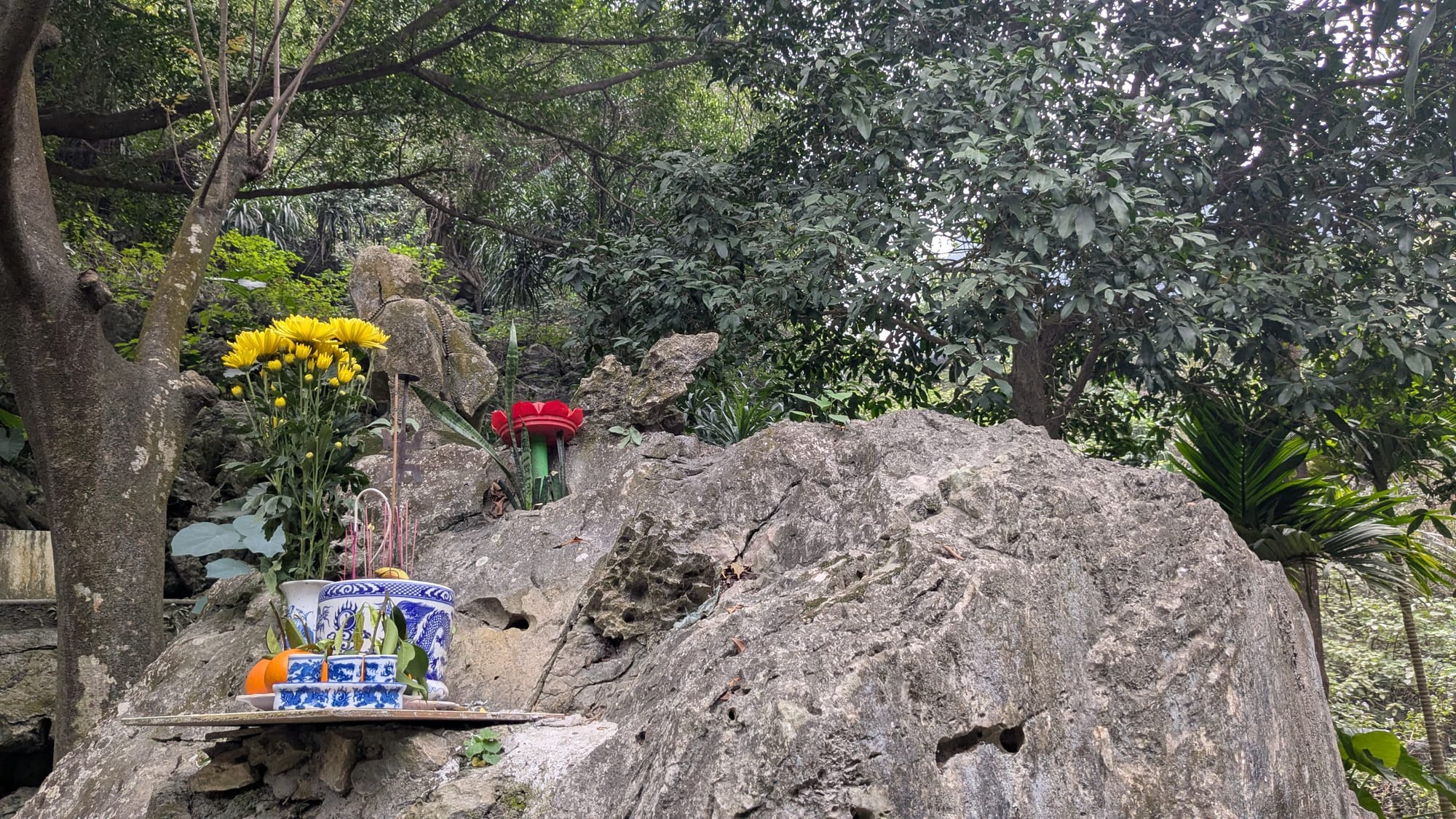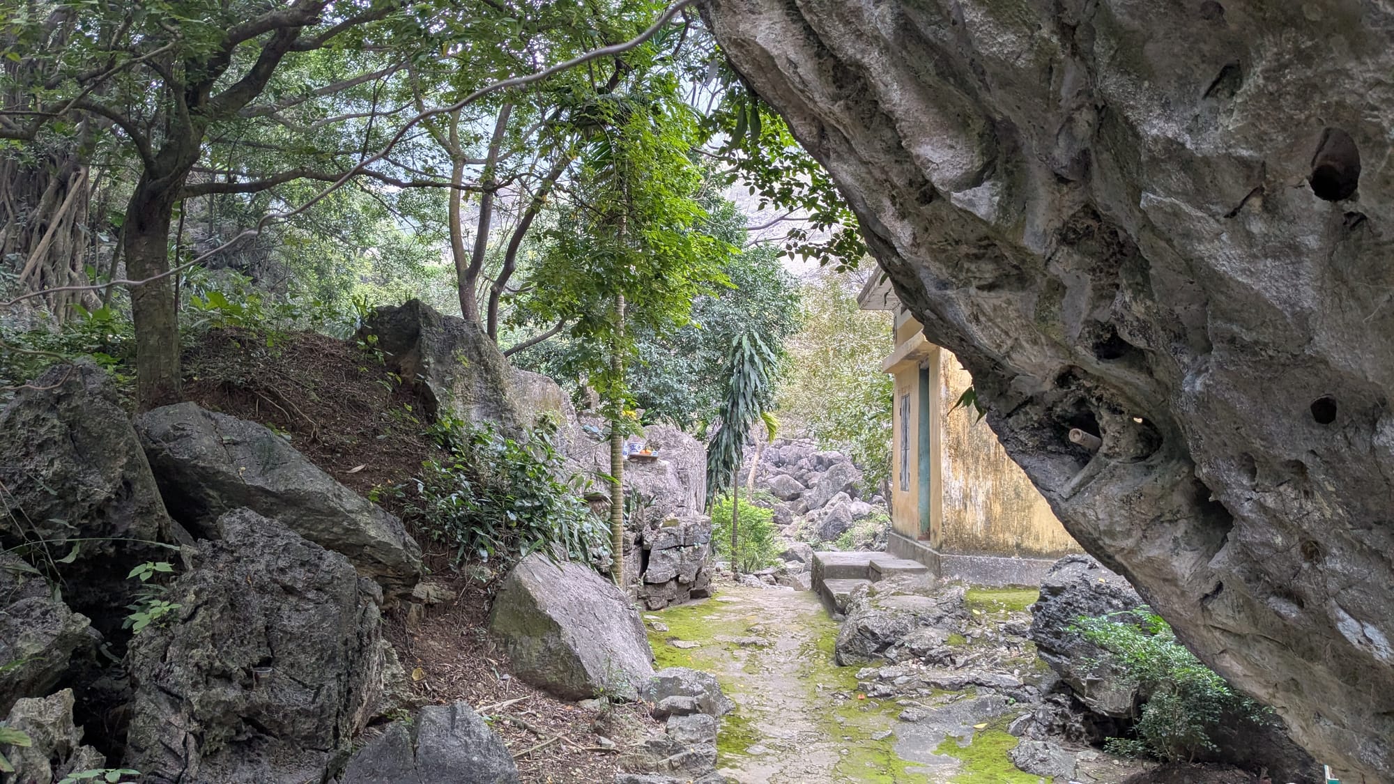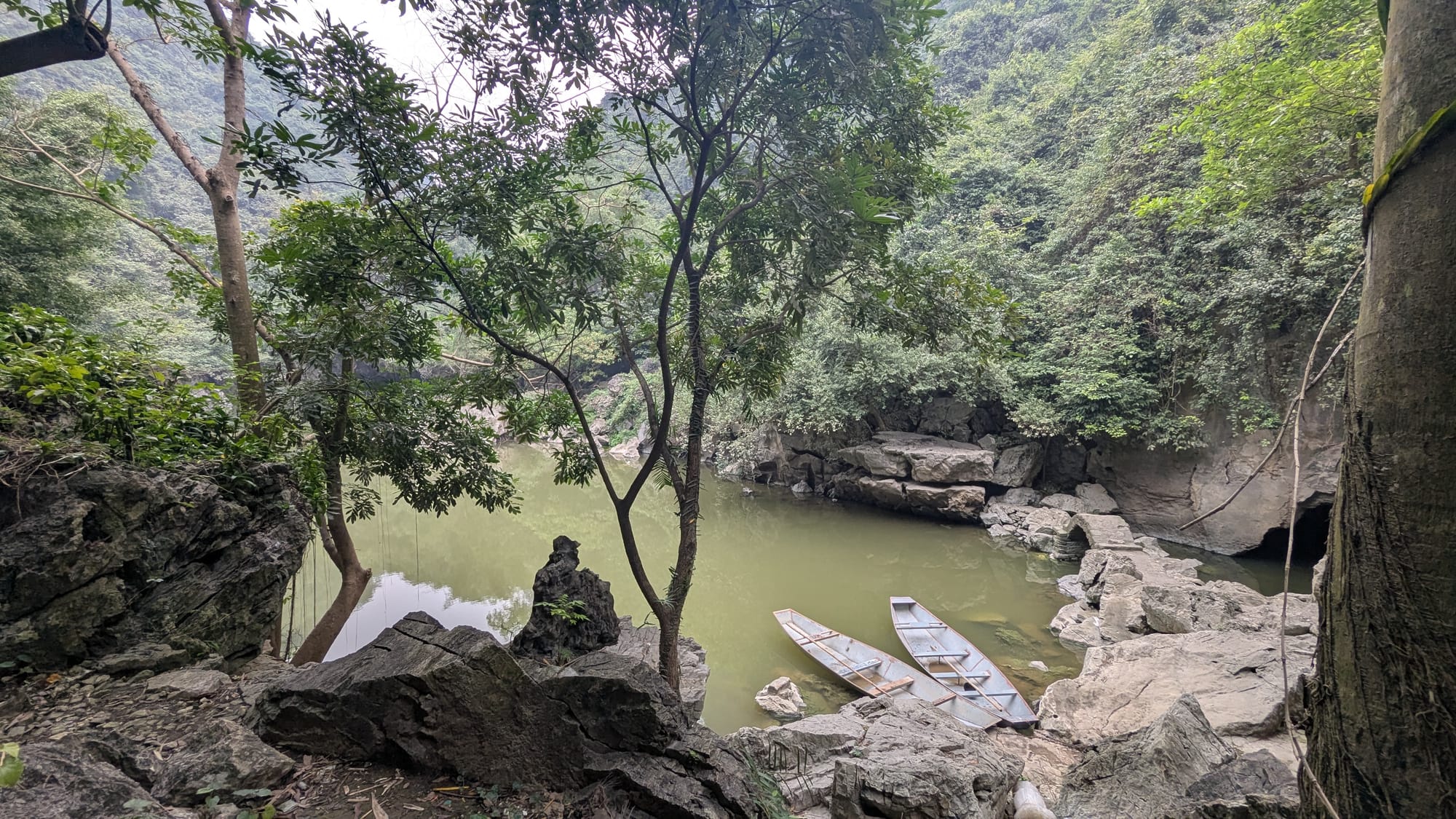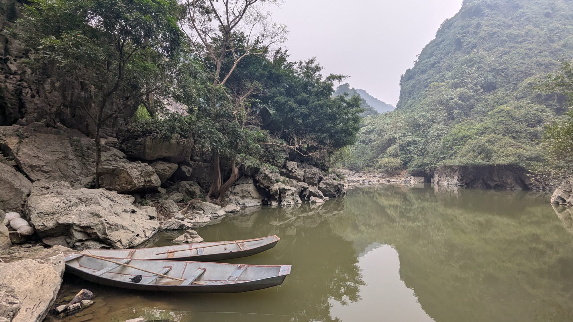 We were the only people there for a time, but soon a young couple also came to sit by the lake, and an older woman came to ply her trade: giving people boat rides into the caves. Not too far away in Ninh Bình, at Tràng An Scenic Landscape Complex, you can take boat tours like this on a much bigger scale, but it was fun to do it in a place most tourists would never find.