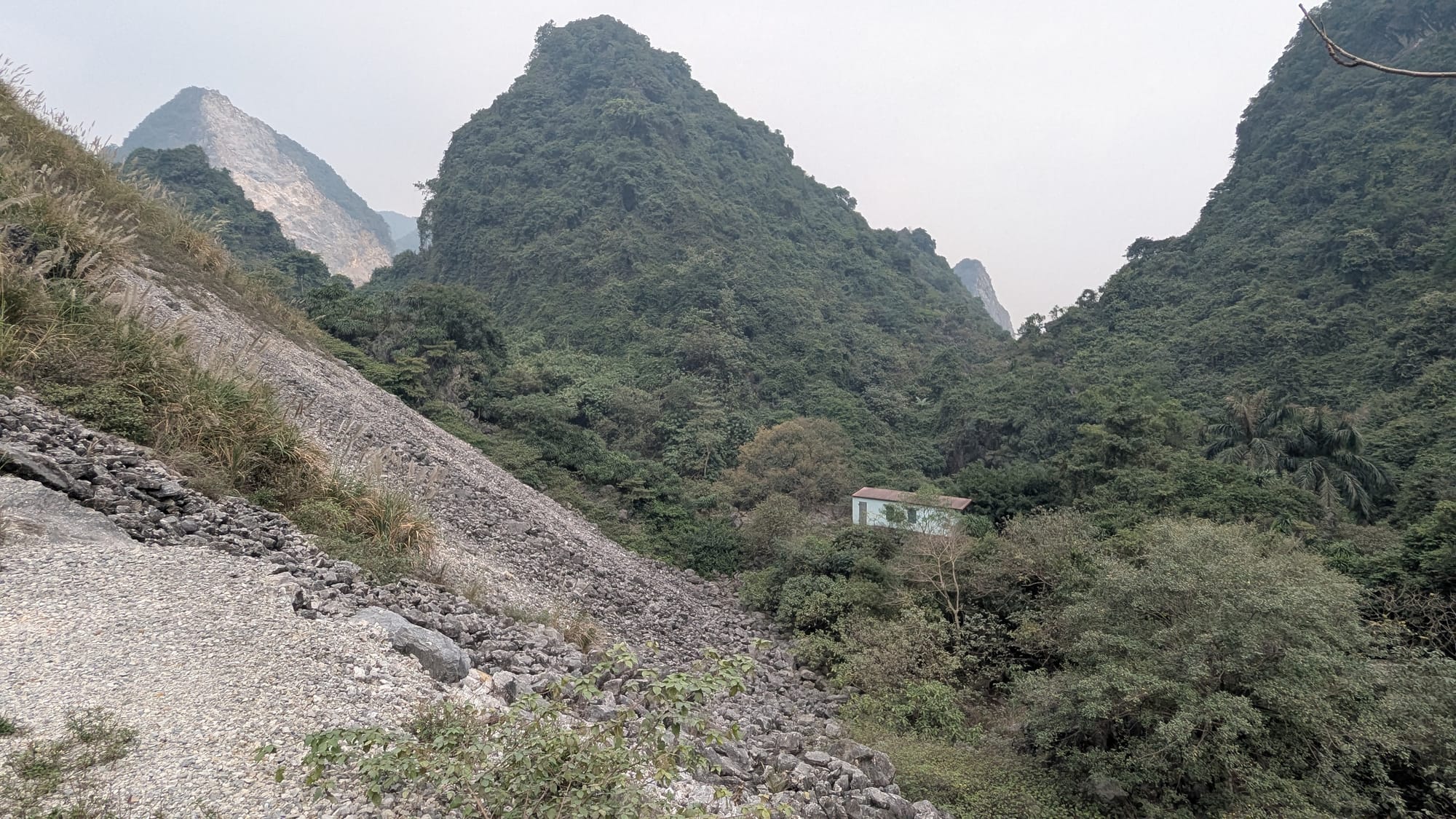 As we got closer to the site, we found the area is a mining community, the tall karst mountains sometimes stripped of vegetation to get to the white limestone rock within. Dust often coats the plants at the sides of the roads.