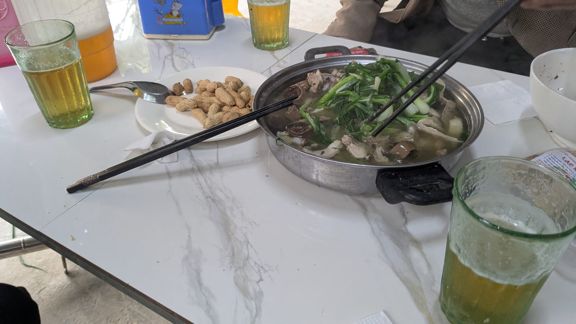 Mr. H asks me if I want to drink beer or wine, and he laughs when I say beer. He hands the green onions to the proprietor who brings them back in a pot with broth. Mr. H then produces the contents of his second plastic bag. It's full of lòng lơn, the assorted pig intestines which are a local staple. He empties it into the broth. We nosh on this and roasted peanuts as various friends of Mr. H come to drink glasses of beer with us.