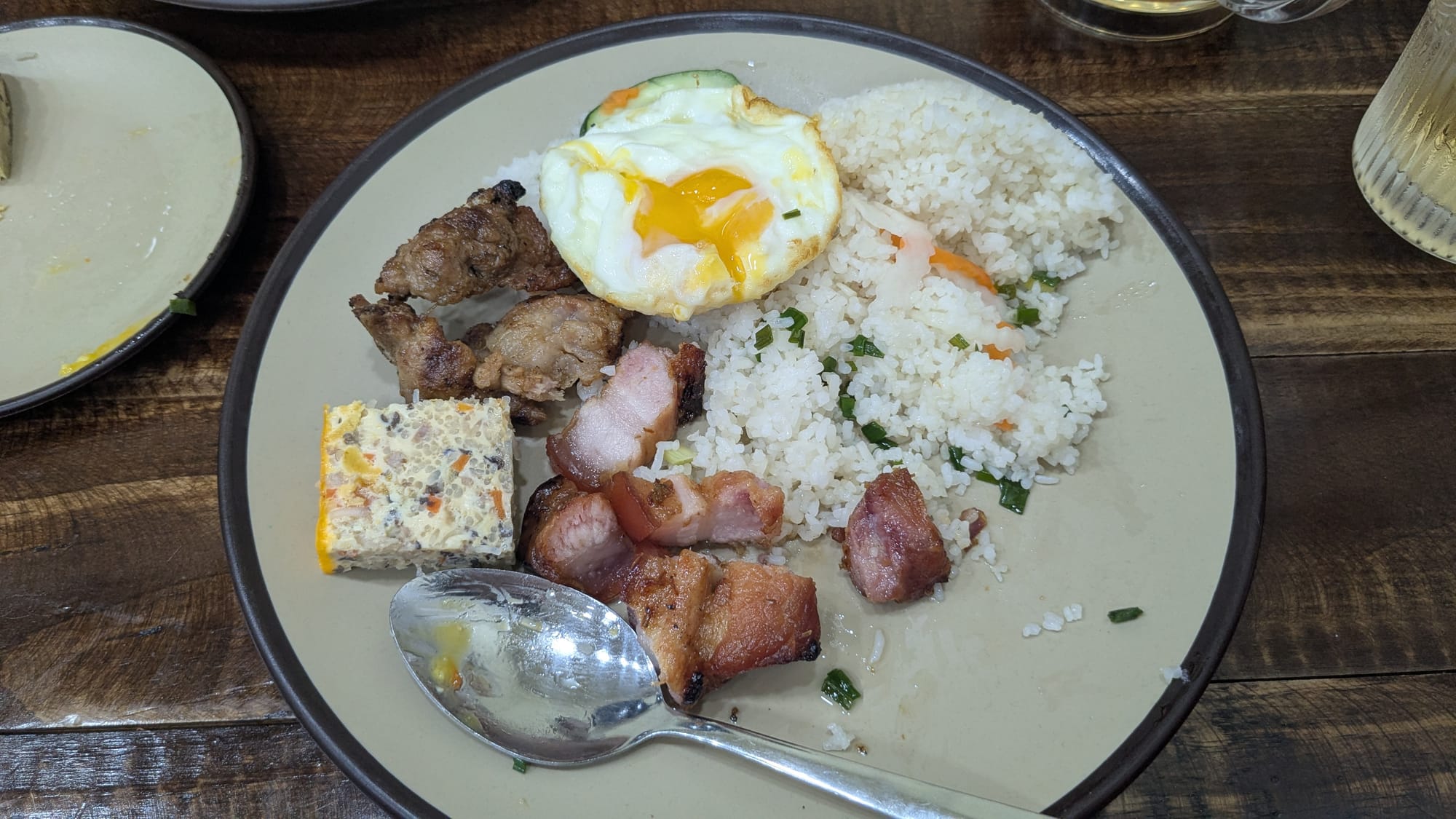 When I finally meet up with Thùy I've walked for probably two hours, nearly all the way to District 3. I get my first taste of Cơm Tầm (Broken Rice). The cheap low-grade broken grains of rice, not fit for export, are the basis of a cheap but delicious meal in the South. It's traditionally served with grilled pork marinated in a sweet sauce, a fried egg, pickled vegetables, an egg casserole, and a spicy-salty-sweet fish sauce that is just the best.