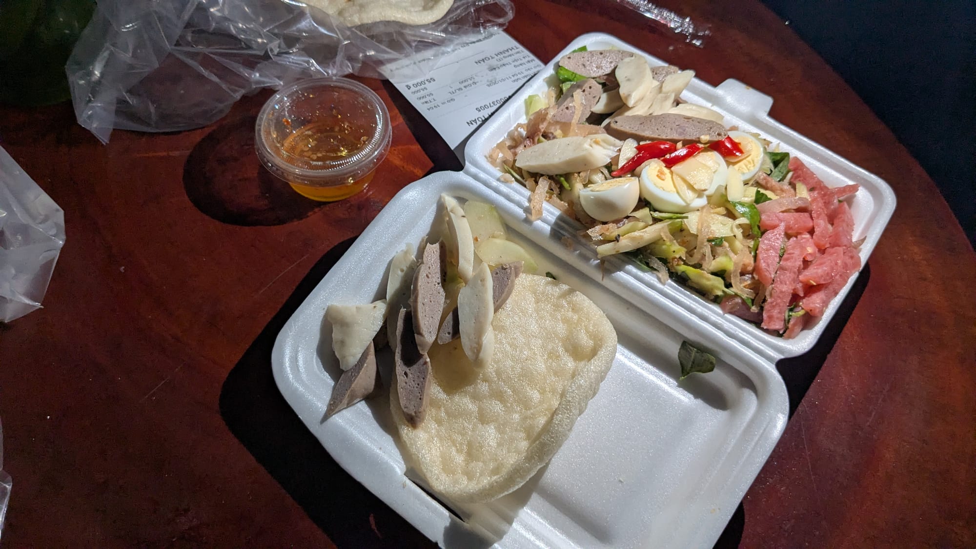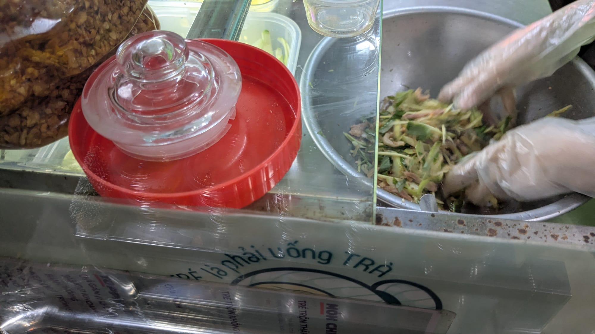 Next we pick up a plate of tré trộn. The shopkeeper scoops slices of chả, a large dense pork sausage, with pickled vegetables, hard-boiled eggs and many ingredients I am unfamiliar with into a mixing bowl where it is mixed with sauce. This salty, sweet, tangy and very spicy mixture is then eaten with crispy shrimp chips; every possible taste bud is engaged at max volume.