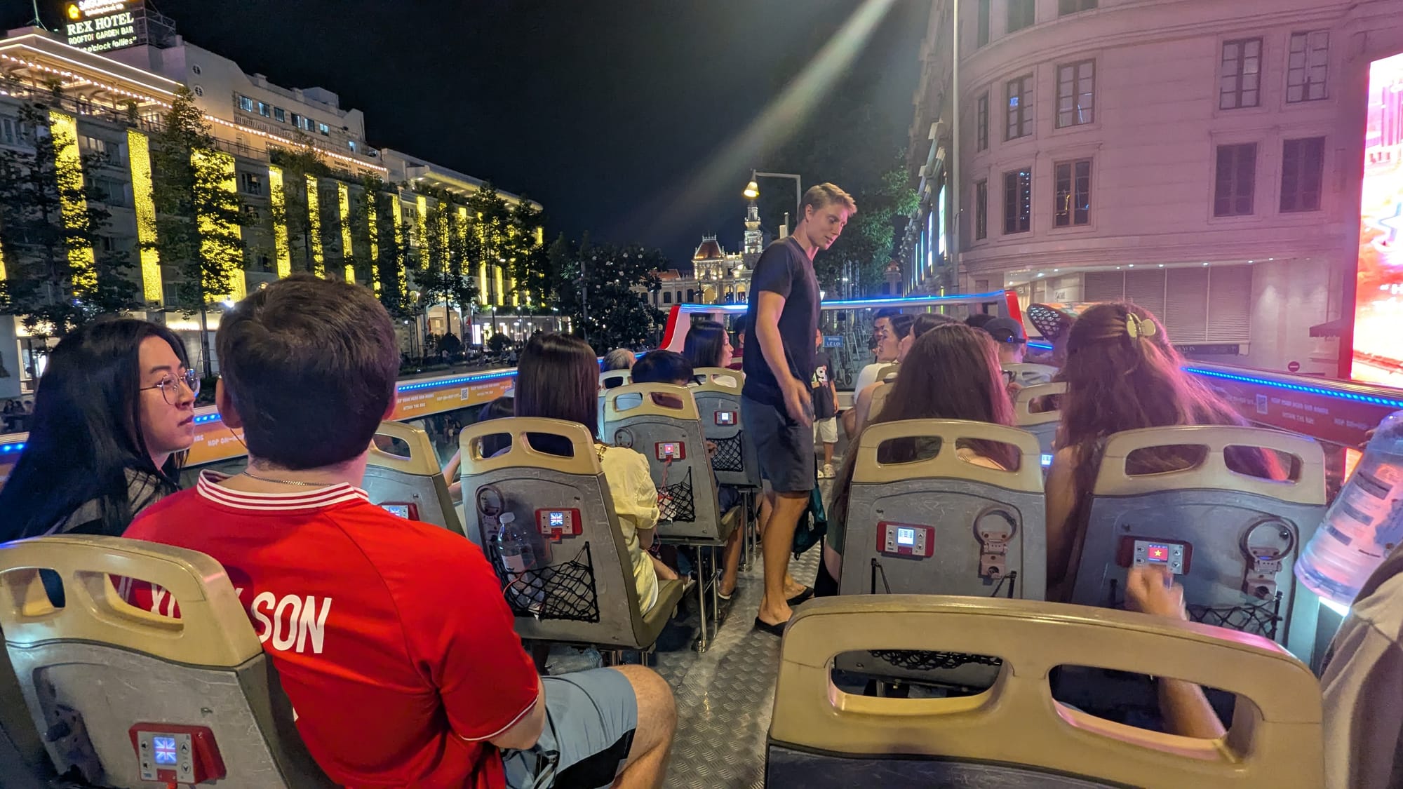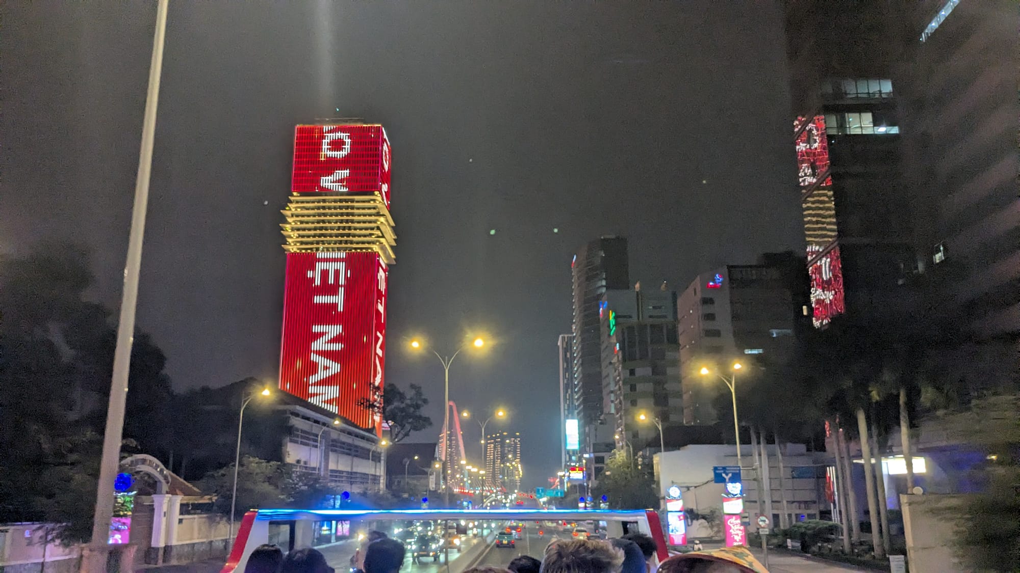 Later in the evening, all of the volunteers meet up to take in the sights of the city from the top of a double-decker tour bus. Harristh provides a humorous tour guide commentary, and we get a great view of the skyline from the bridge across the river into District 2.