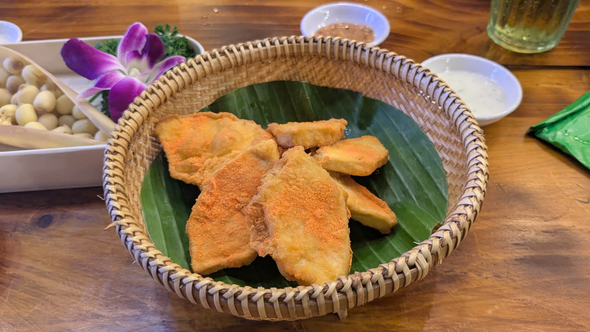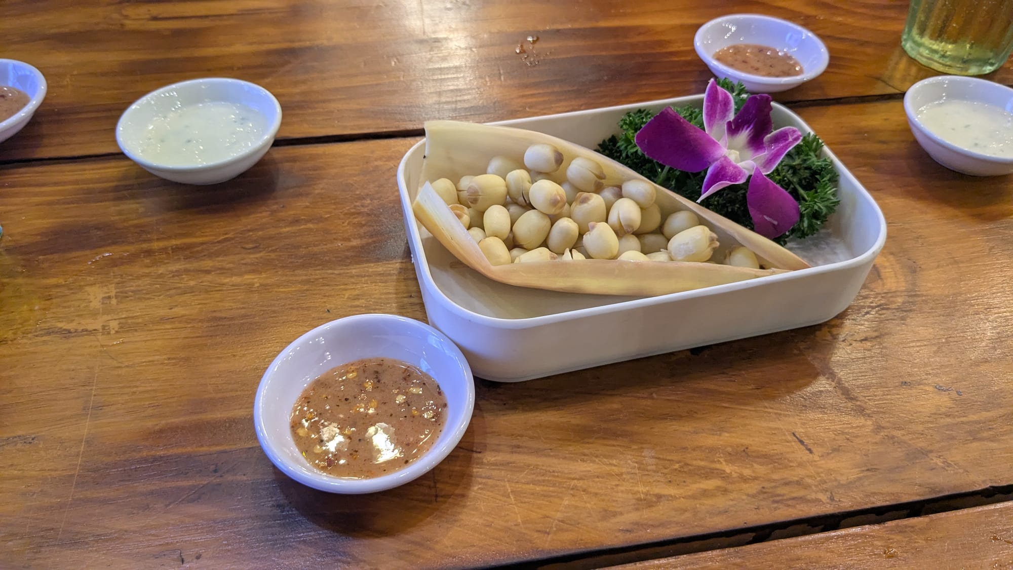 A few of the boys decide we can't finish the day without a few glasses of fresh beer, and we learn that even the bar snacks are a little different in the south. We order steamed lotus seeds with a tangy dipping sauce, and some fried potatoes which are dusted in a sweet cheese powder. Normally, I don't like the cheese powder, but here it's very tasty.