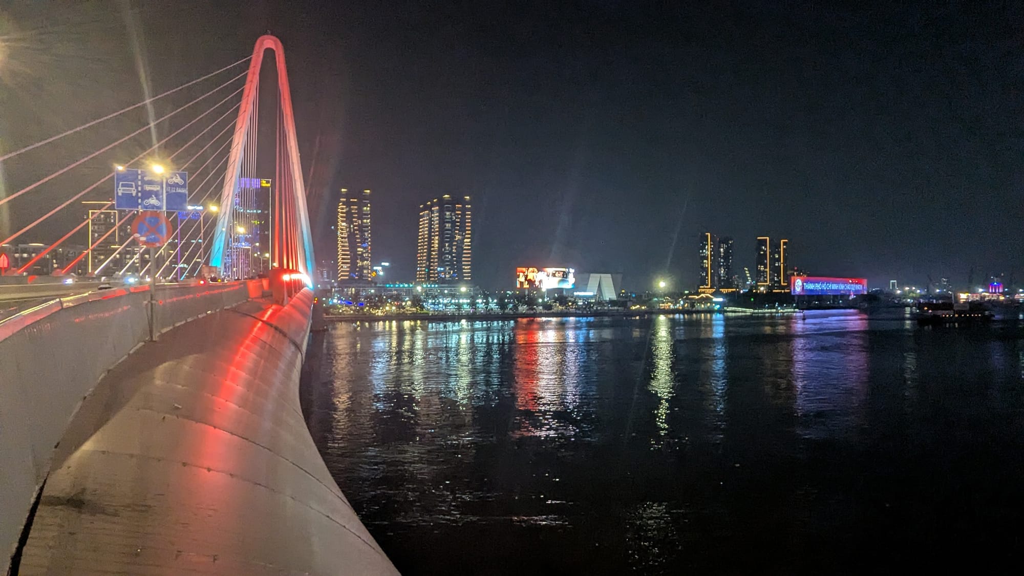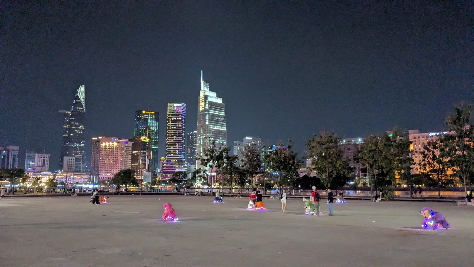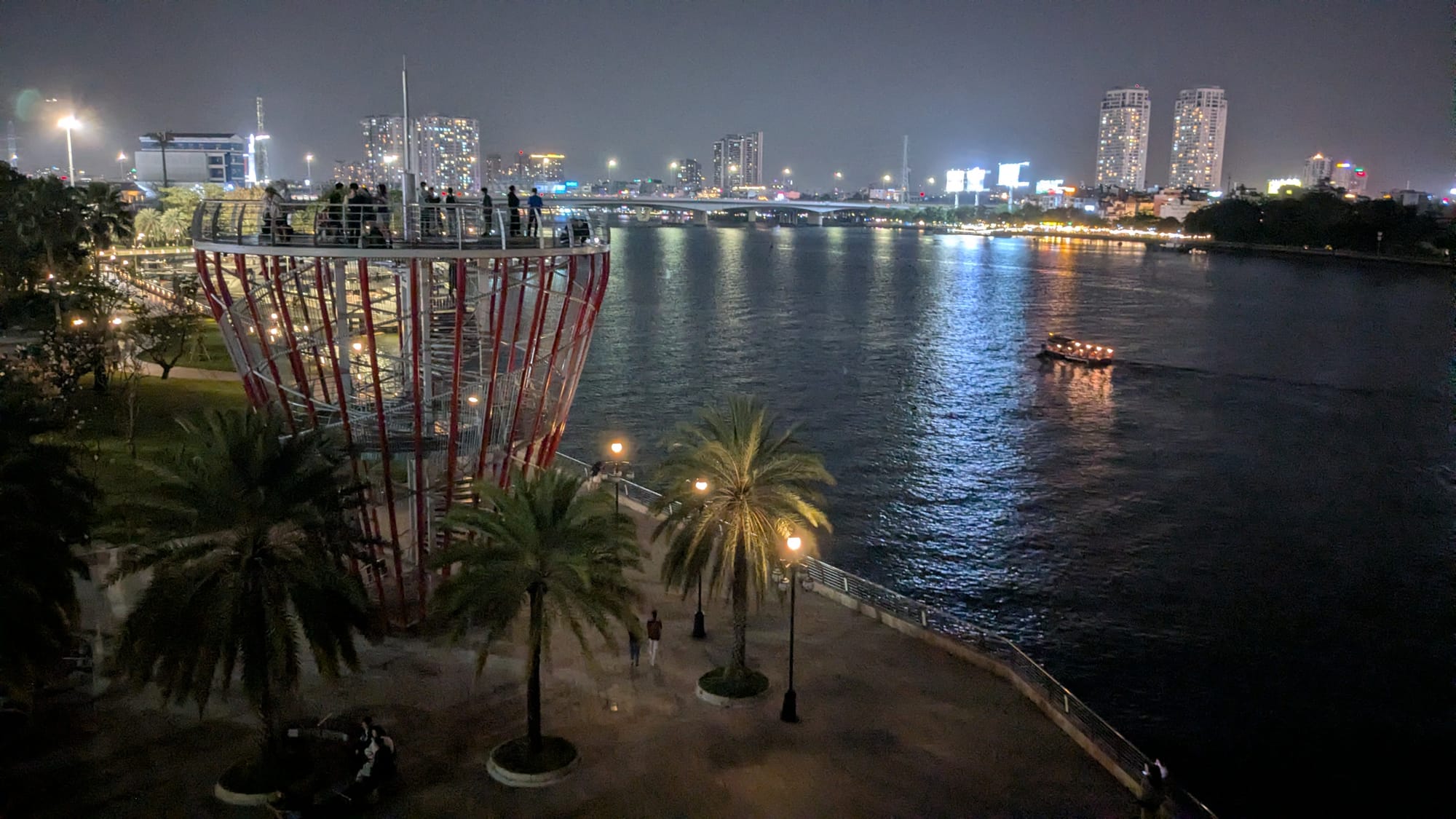 Afterwards, we buy tallboys of beer and hike across the bridge to a riverside park in District 2 with a permanent carnival. The narrow walking path is dotted with dozens of people taking photos or selfies, necessitating stepping down into traffic lanes, but traffic is light and it doesn't feel dangerous.