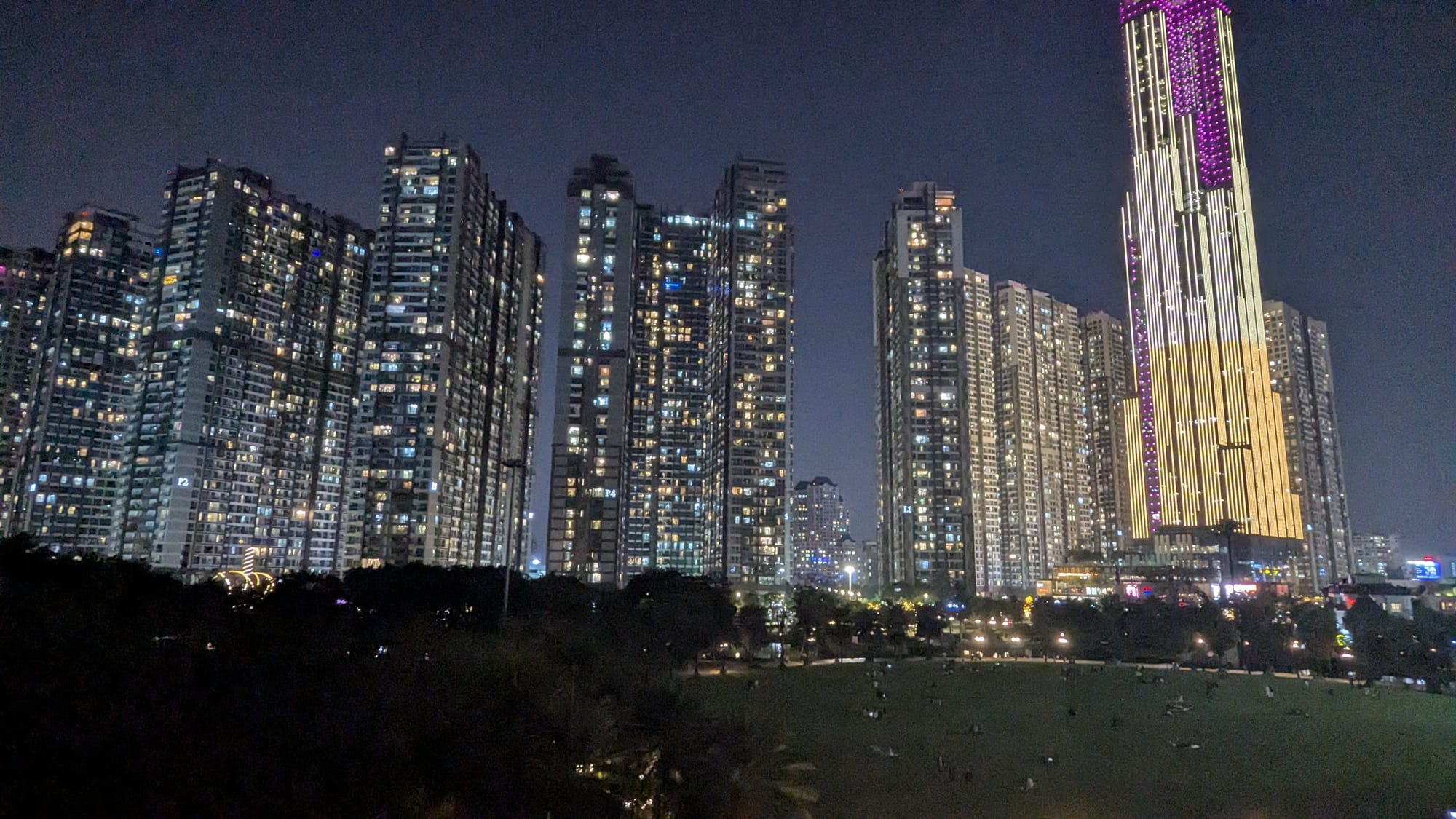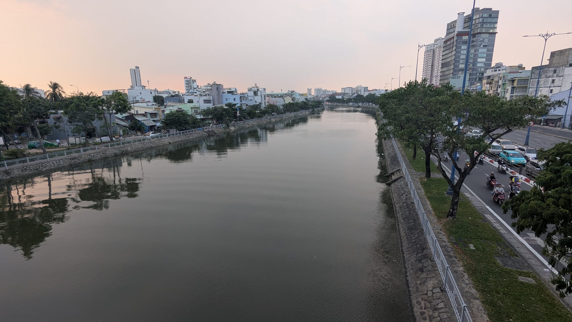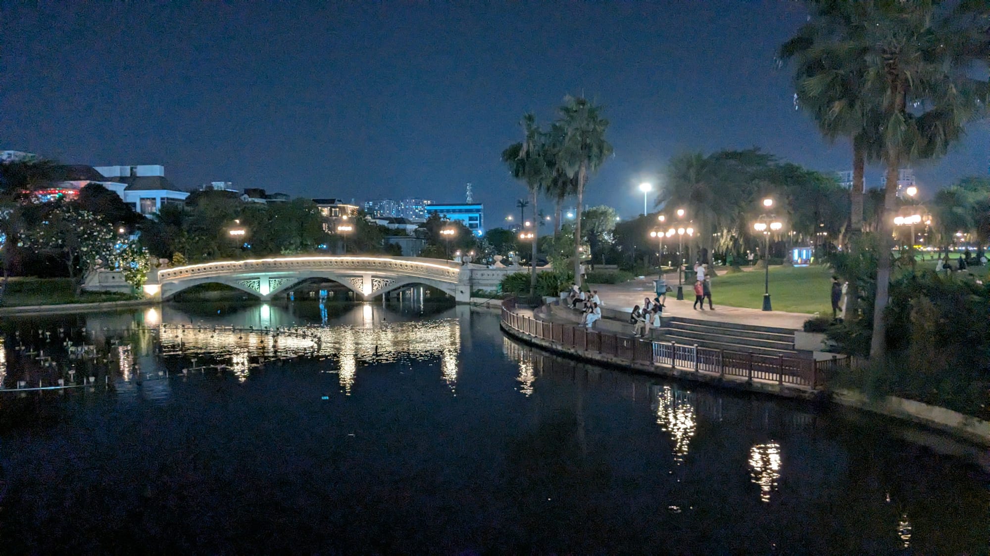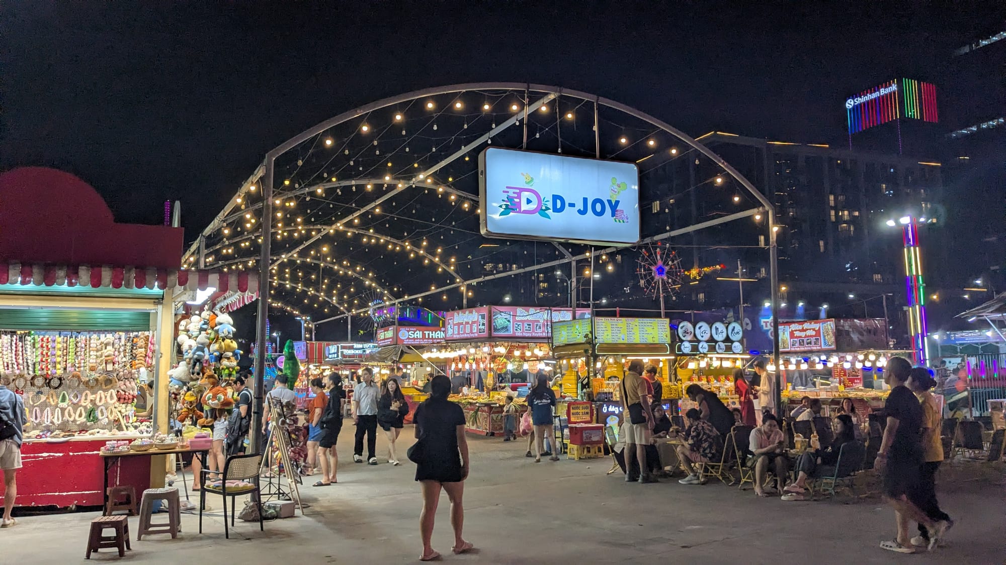 Afterwards, we buy tallboys of beer and hike across the bridge to a riverside park in District 2 with a permanent carnival. The narrow walking path is dotted with dozens of people taking photos or selfies, necessitating stepping down into traffic lanes, but traffic is light and it doesn't feel dangerous.