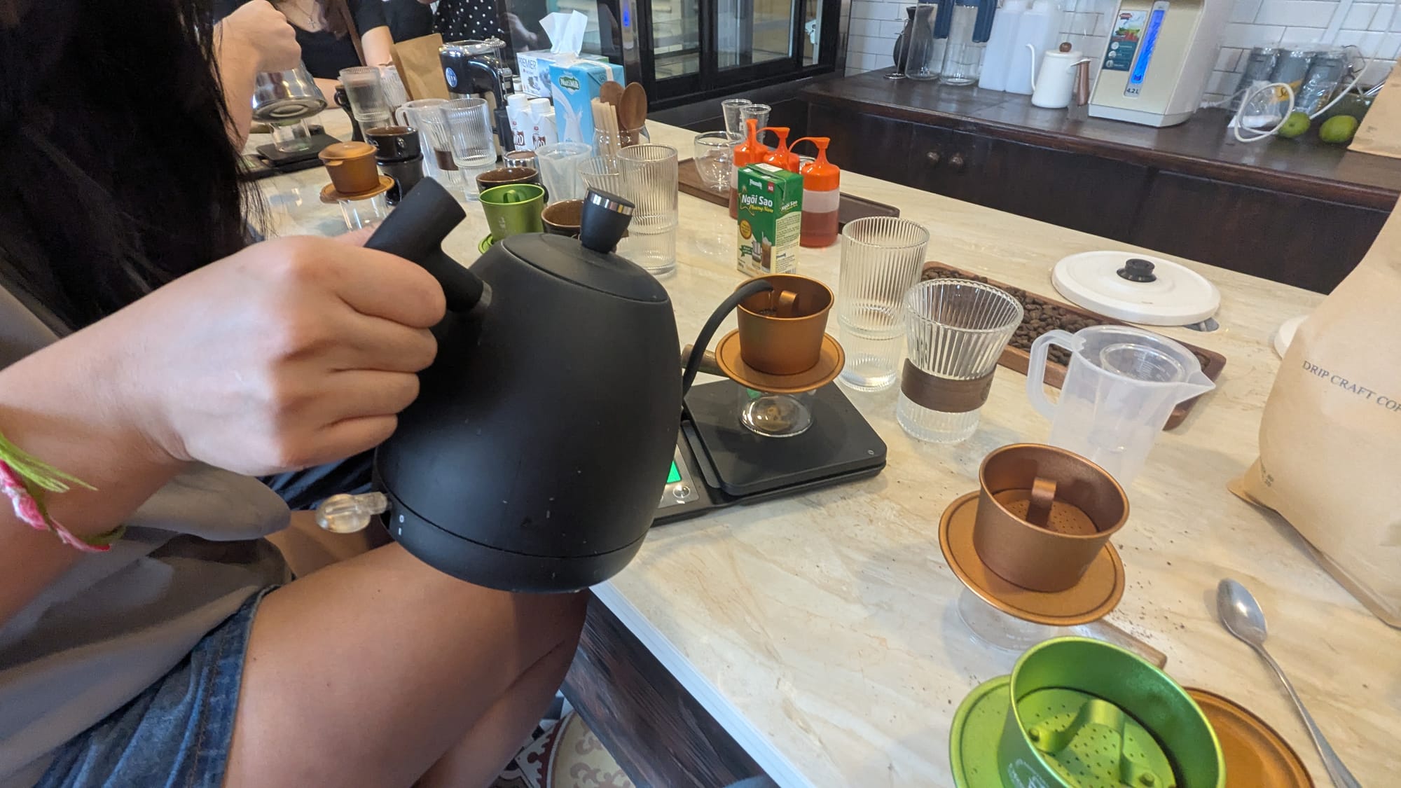The staff has us weigh out very specific amounts of ground coffee and boiling water.