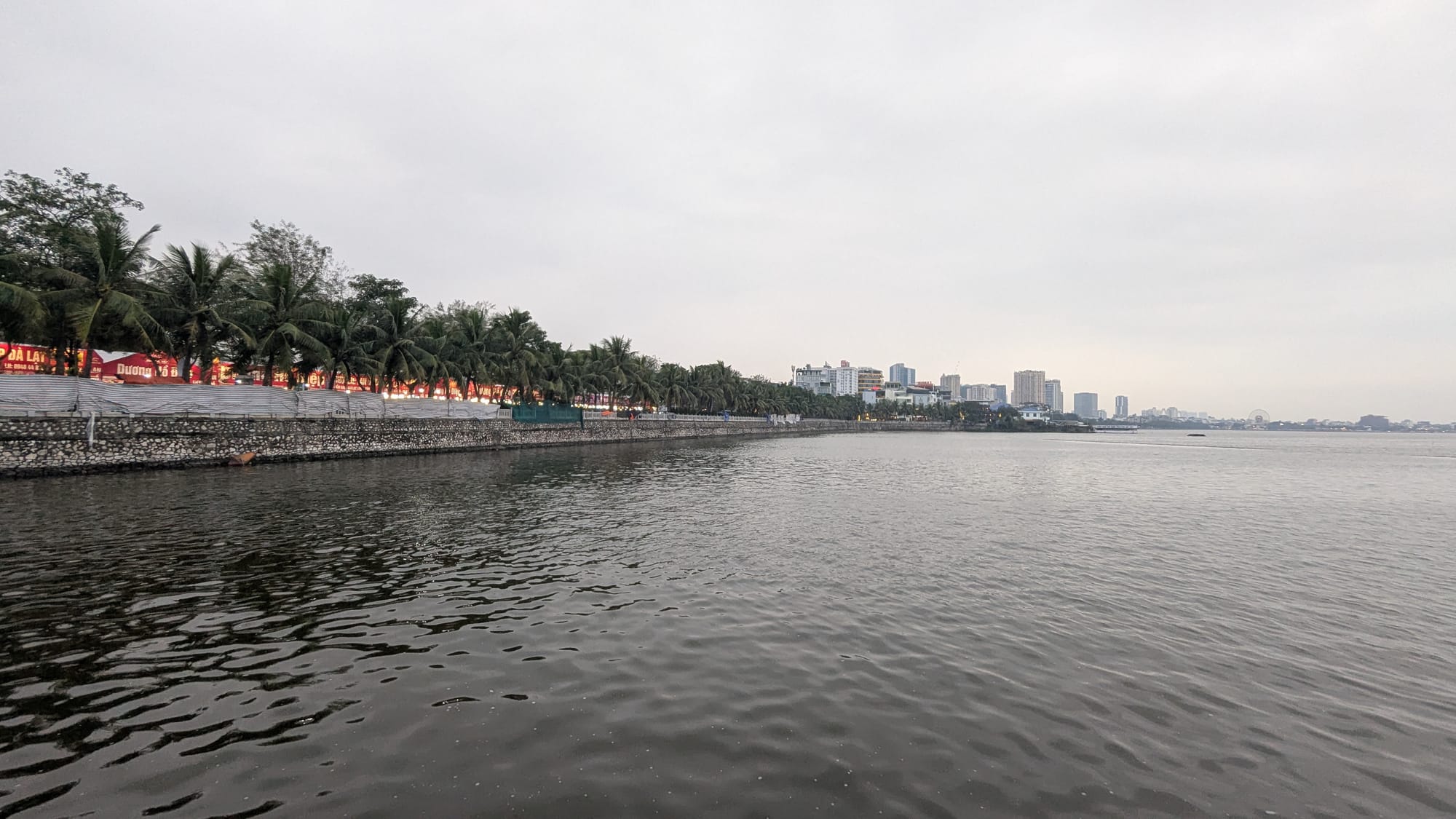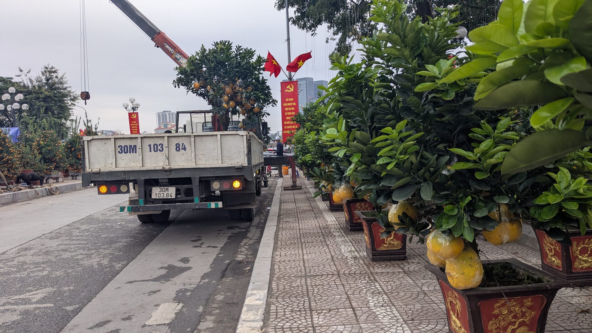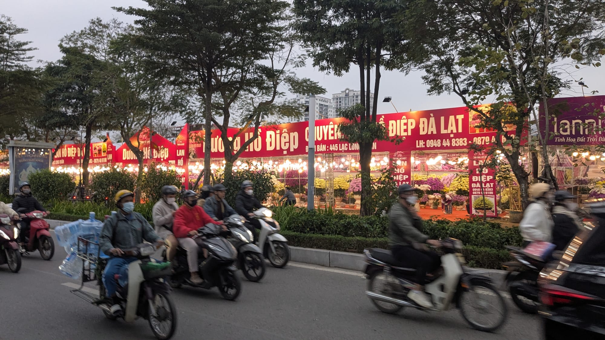 Afterwards, Sean and Sophia and I wander around to look for something good for dinner. This side of the West Lake is also very nice and full of high end coffee shops and bars overlooking the lake. There are temporary shops setup along one road with flowers from all around Việt Nam. People are buying flowers for the upcoming Lunar New Year holiday (Tết ) and loading potted kumquat trees full of the little orange fruits onto the backs of their motorbikes.