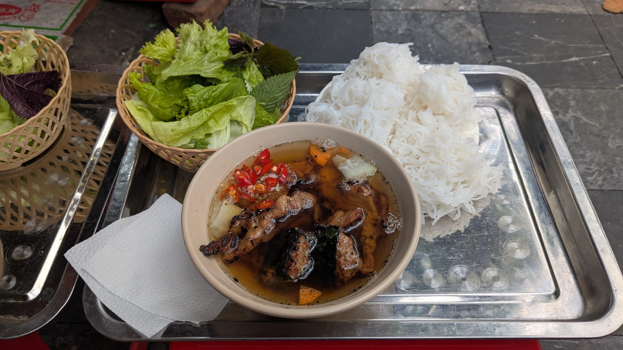Looking for something to eat, we often take the opportunity in the city to eat something approaching American brunch. But now we've also been here long enough to just crave good Hà Nội food. And we are quickly tempted by the smells coming from the grill of a good bún chả place. The only seating at this bún chả place is in a narrow alley and out in front on the sidewalk; one of the owners pulls out two plastic stools for us on the sidewalk. The auntie is squatting on the pavement in front of a portable charcoal grill, charring skewers of meat.