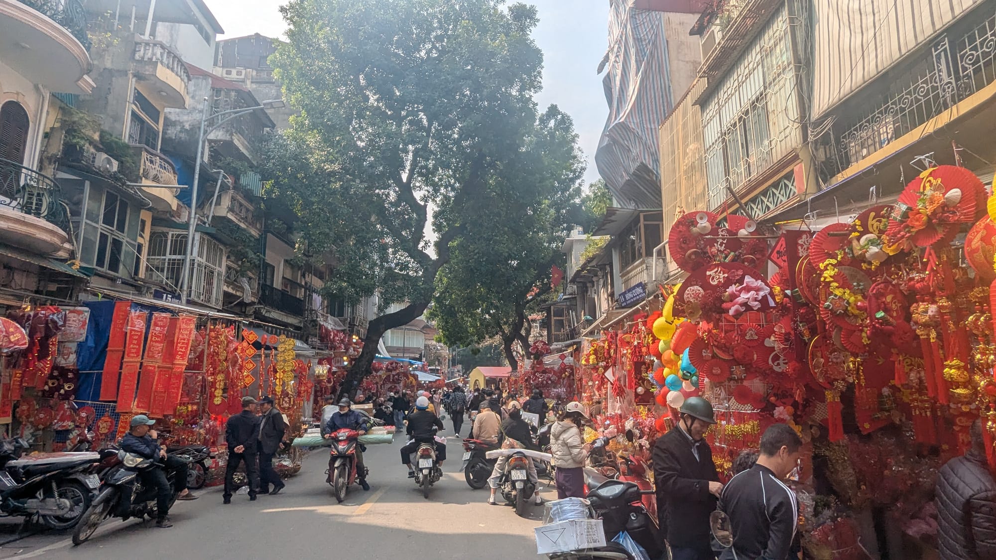 In the morning, I catch back up with Sean in the Old Quarter to hang out and look for a few things. For one, I always need an ATM, and I am hoping to buy some decorations for my room for Tết . The shops along any street are bursting with red decorations and LED powered color-changing red lanterns.