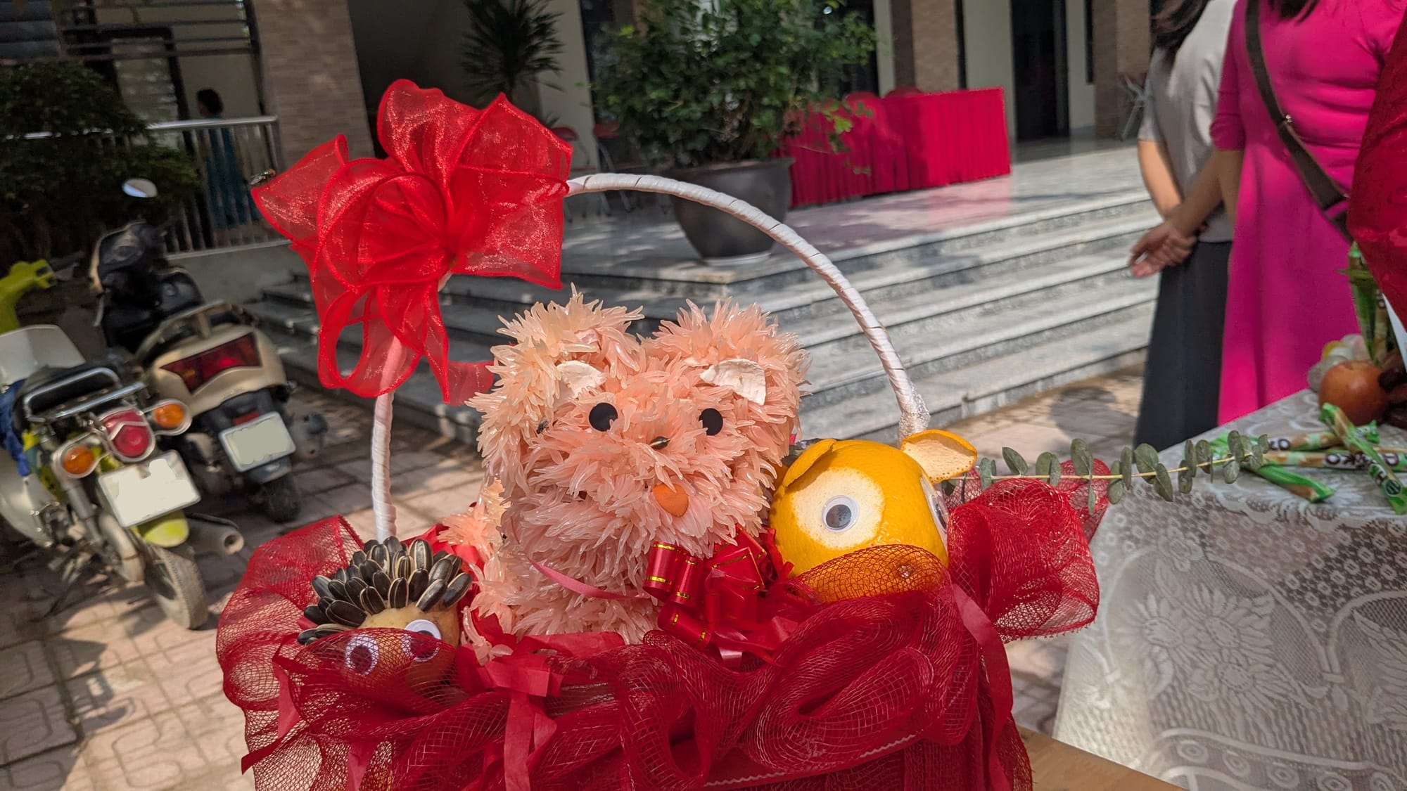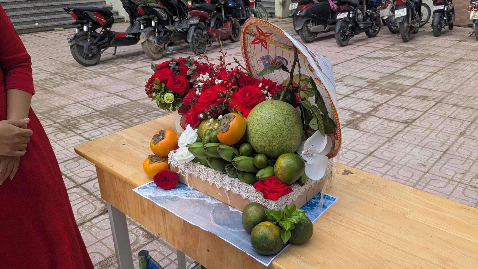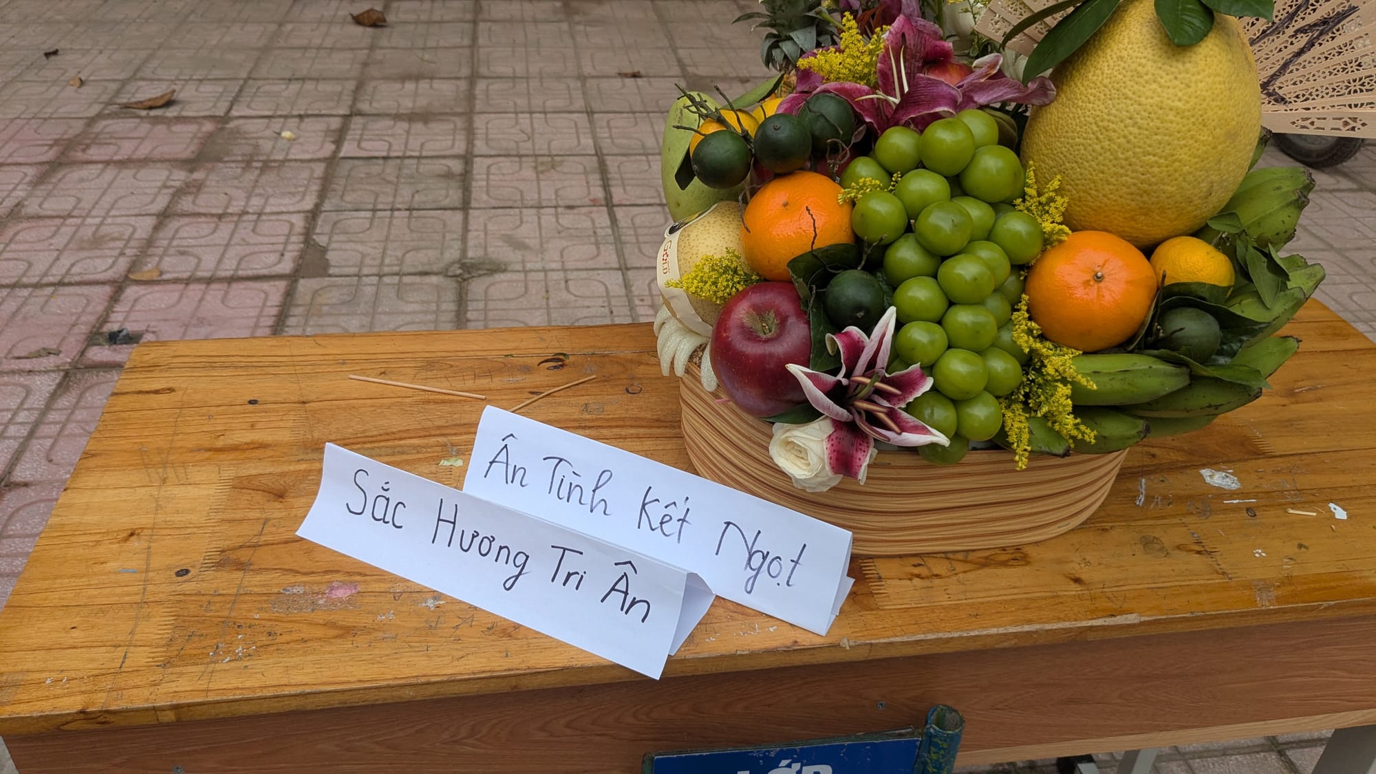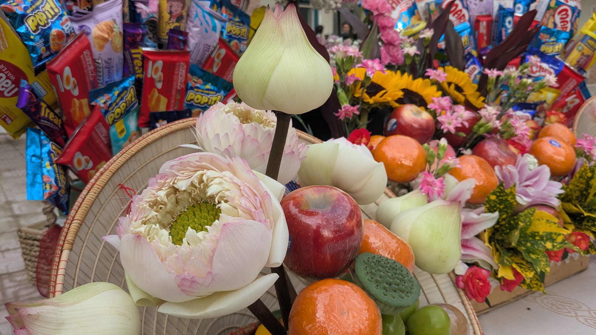I learned that festive fruit trays in Việt Nam, for this holiday and others, should contain (at least) five types of fruit symbolizing the five elements of earth, a core belief present in their five-colored religious flags.